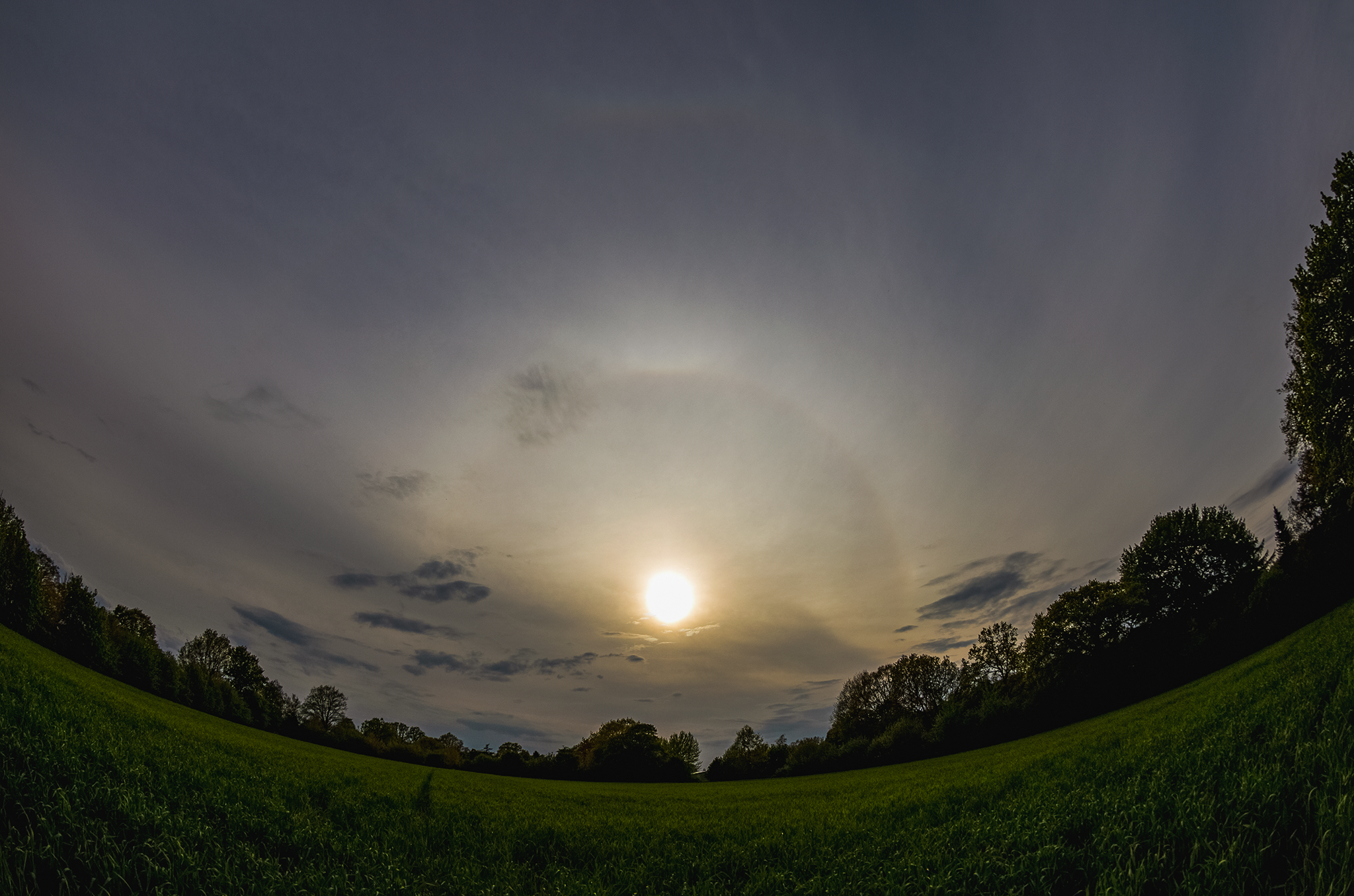 Am Abend des 20. Mai 2021 hat sich tatsächlich nochmal die Sonne durch die hohe Wolkendecke kämpfen können und sich mit einem, wenn auch nur leicht sichtbaren Halo, 22-Grad-Ring mit OBB und 46-Grad-Infralateralbogen sowie rechter NS gezeigt. Aufnahmenbedingungen eher suboptimal, da aufgrund eines vorangegangenen Starkschauergebietes extrem hohe Luftfeuchtigkeit in der Luft lag. Aufgenommen um 19.13 Uhr über Prisdorf mit Canon 6D, Canon Fisheye 8-15 f/4.0 (bei 15 mm, f/8), ISO-100, 1/800 Sek.