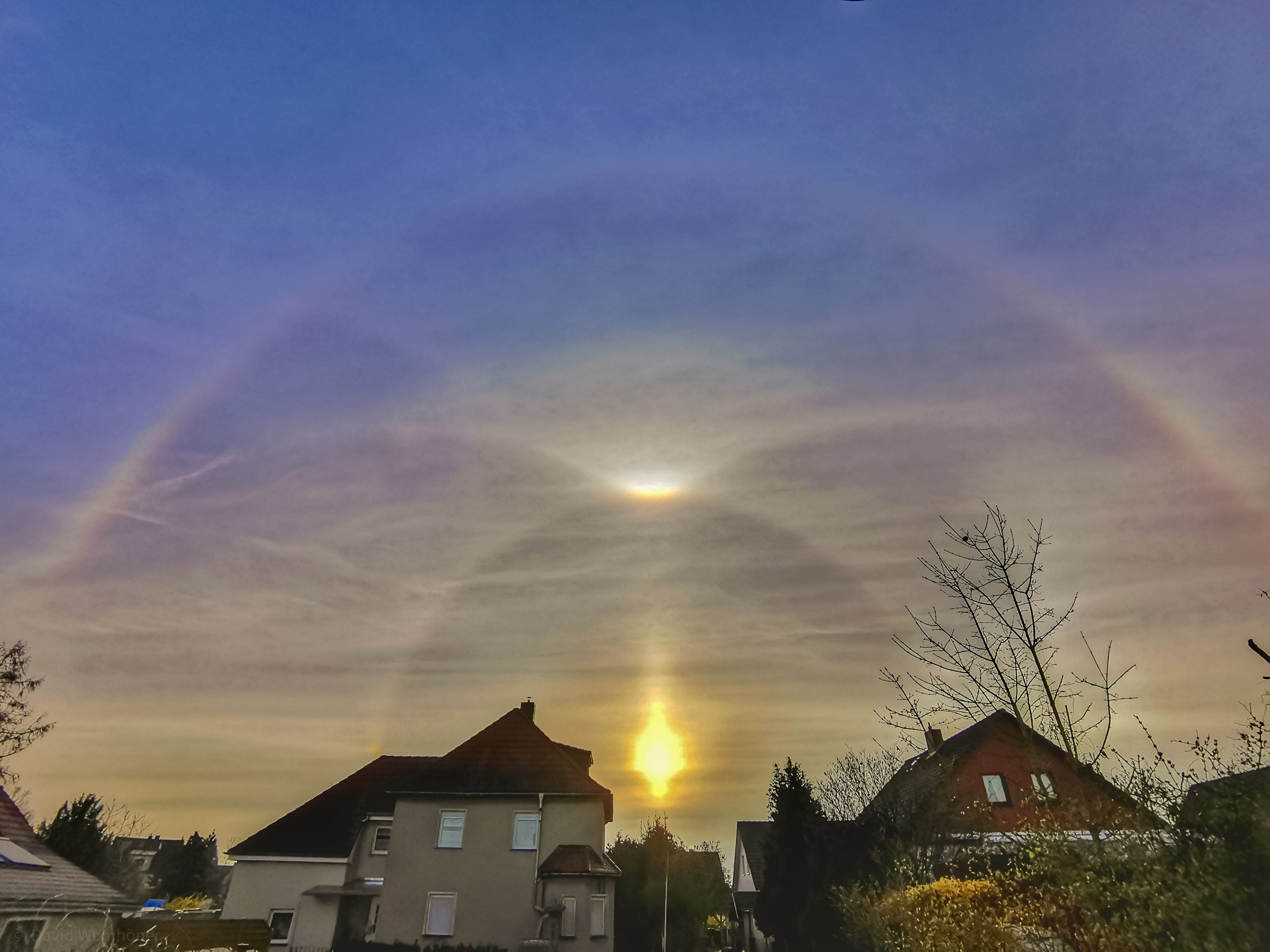 Hier ein Sonnenhalo, den ich am 13. April 2021 in Westsachsen aufgenommen habe. Zeit 7:00 Uhr. Es ist eine bearbeitete Handyaufnahme. Die beiden Nebensonnen liegen dummerweise genau hinter den beiden Häusern.