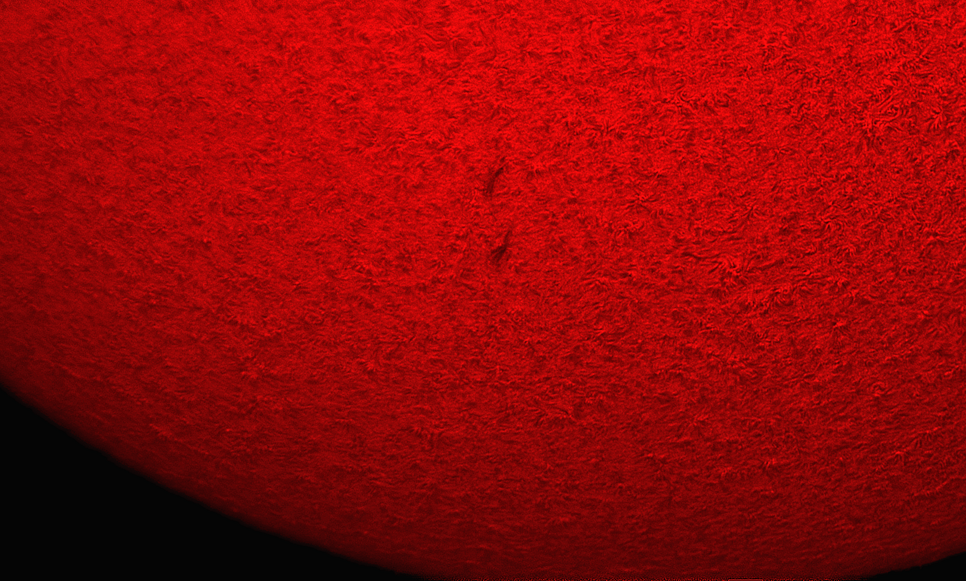 "Auf der Sonne ist im Minimum nichts los - Sonne hat Schlaf" könnte man meinen. Aber bei genauem Hinsehen mit einem H-Alpha-Teleskop ist diese Aussage so nicht zu halten! Klar, das stimmt: Die Aktivität ist auf dem kleinsten Level. Aber man findet trotzdem lohnende Elemente, wie hier zwei kleine Filamente. Betrachtet man das Bild etwas näher, so erkennt man, dass die Oberfläche der Sonne ganz schön in Bewegung sein muss. Sehr plastisch sieht man, dass es brodelt und kocht. Auch die Filamente wirken dreidimensional - was ja auch so ist. Ich habe das Bild in der Farbe der H-Alpha-Linie gelassen, so stimmt es überein mit dem visuellen Eindruck.