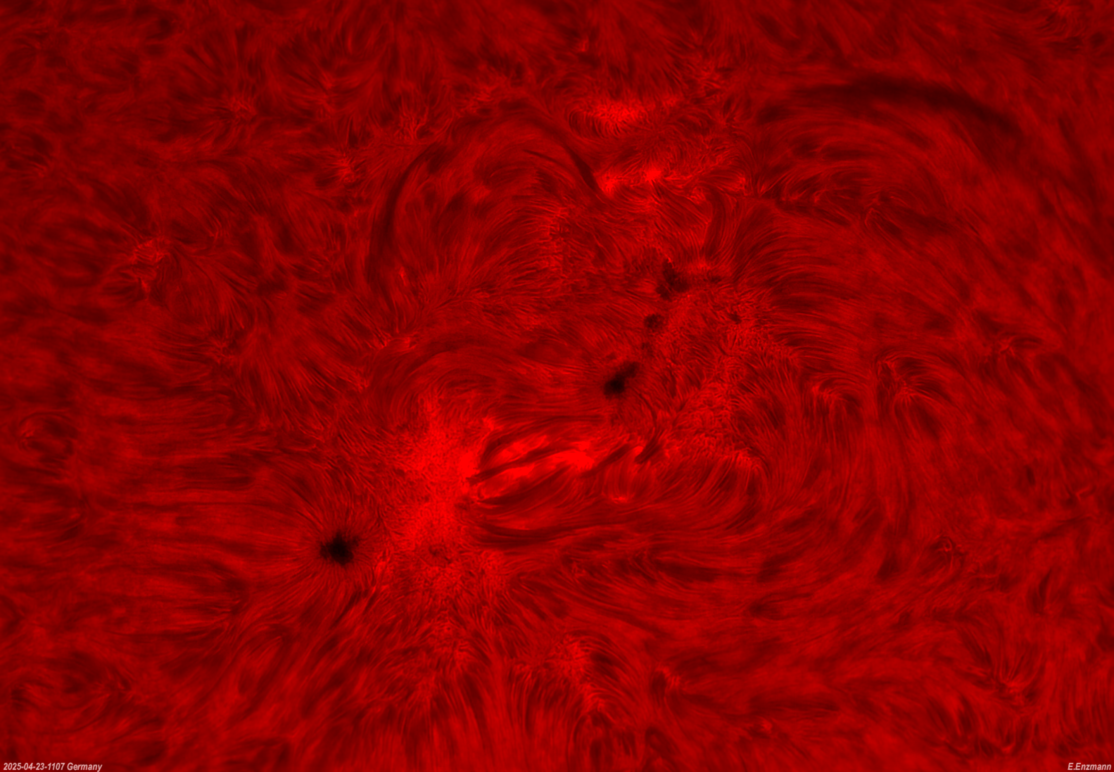 Meine erste Aufnahme dieses Jahr von der Oberfläche der Sonnen in H-Alpha vom 23. April 2025. Das Teleskop wurde off axis mit 290 mm betrieben. Eine Sonderanfertigung der Firma Baader mit einem 290 mm großen DERF Energieschutzfilter und ein von mir entwickeltes Etalon-Blockfiltersystem wurde verwendet. Aus einem 1 min. langem Video wurden die besten 100 Bilder gestackt und mit PS nachbearbeitet.
