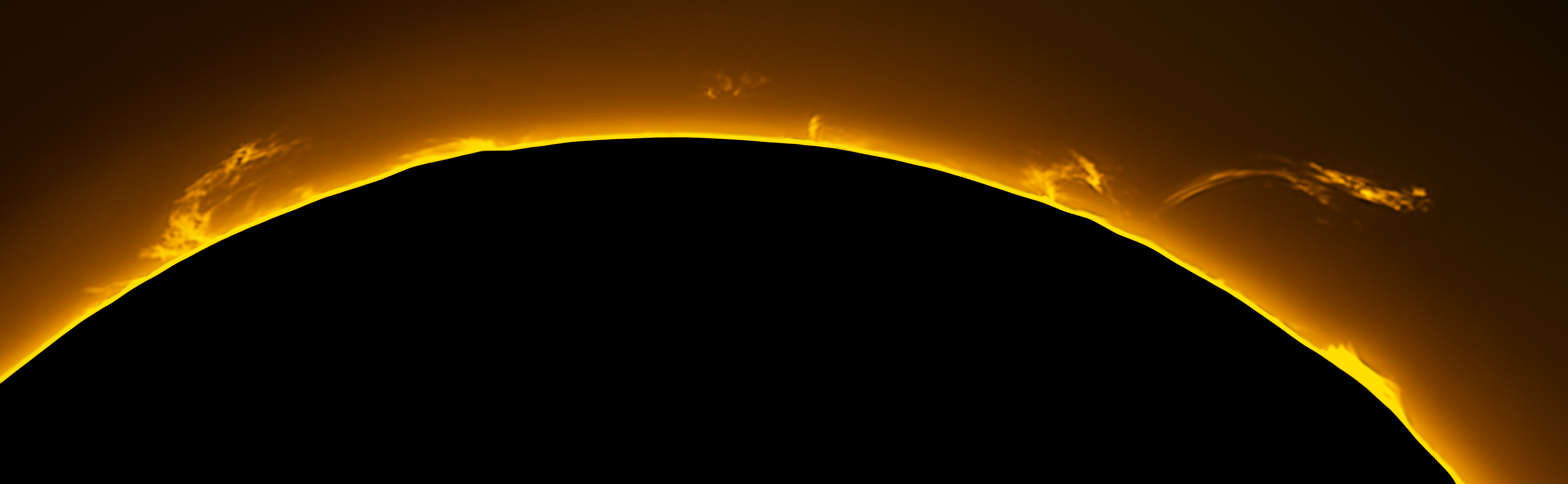 Nachdem ich an diesem Morgen bereits die Protuberanzengruppe am Westrand festgehalten hatte, schaute ich mir knappe drei Stunden später diese Gegend nochmals an. Und welche Überraschung: Die Protuberanz rechts zeigt ein völlig anderes Bild. Das wollte ich natürlich festhalten. Wie meist, wurde ein AVI mit 20000 Bildern und 1200 Bildern gestackt.