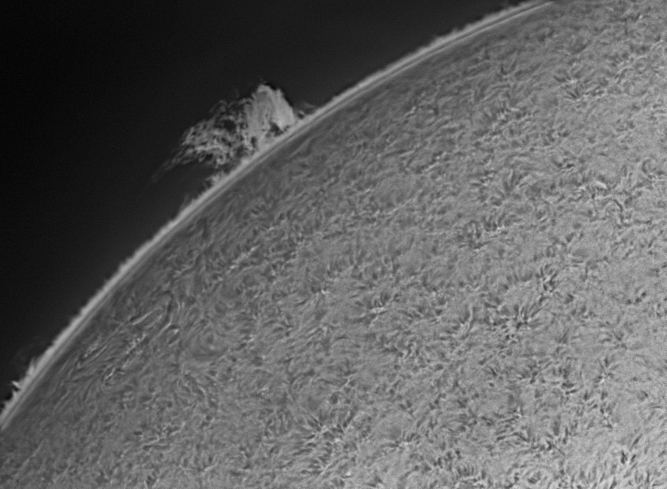 Gestern war mal wieder Sonnenschein und ich konnte einige schöne Protuberanzen beobachten. Die größte davon konnte ich im Bild festhalten. Das Seeing war so lala...