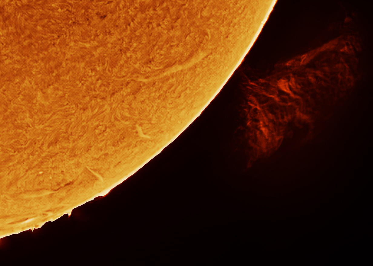 Diese Aufnahme einer Sonnenprotuberanz entstand am 1. Januar 2014. Nach einer langen Silvesternacht raffte ich mich auf und fuhr los, um die Sonne vor die Linse zu bekommen. Durch Zufall lichtete ich diese riesige Protuberanz ab, die zig-fach so groß wie unsere wunderbare Erde ist.