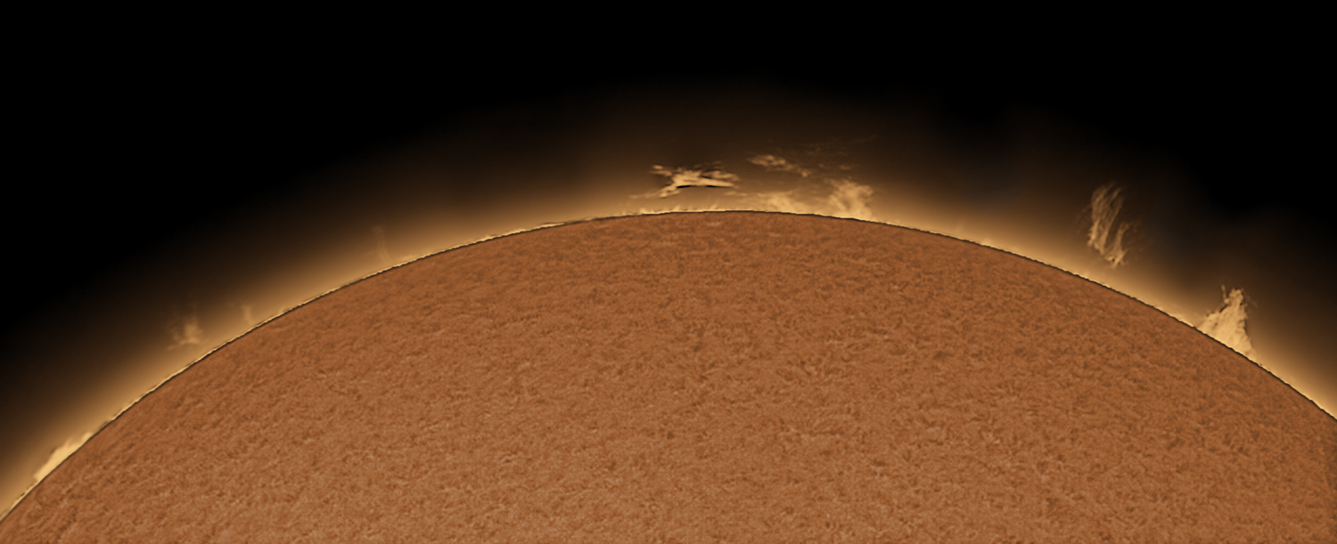 Der Morgen des 10. Juli war endlich mal wolkenlos. Am Südwestrand der Sonne waren schöne Protuberanzen sichtbar. Aufnahmen jeweils für Protuberanzen und Oberfläche separat. Nach Bearbeitung zusammengefügt und eingefärbt.