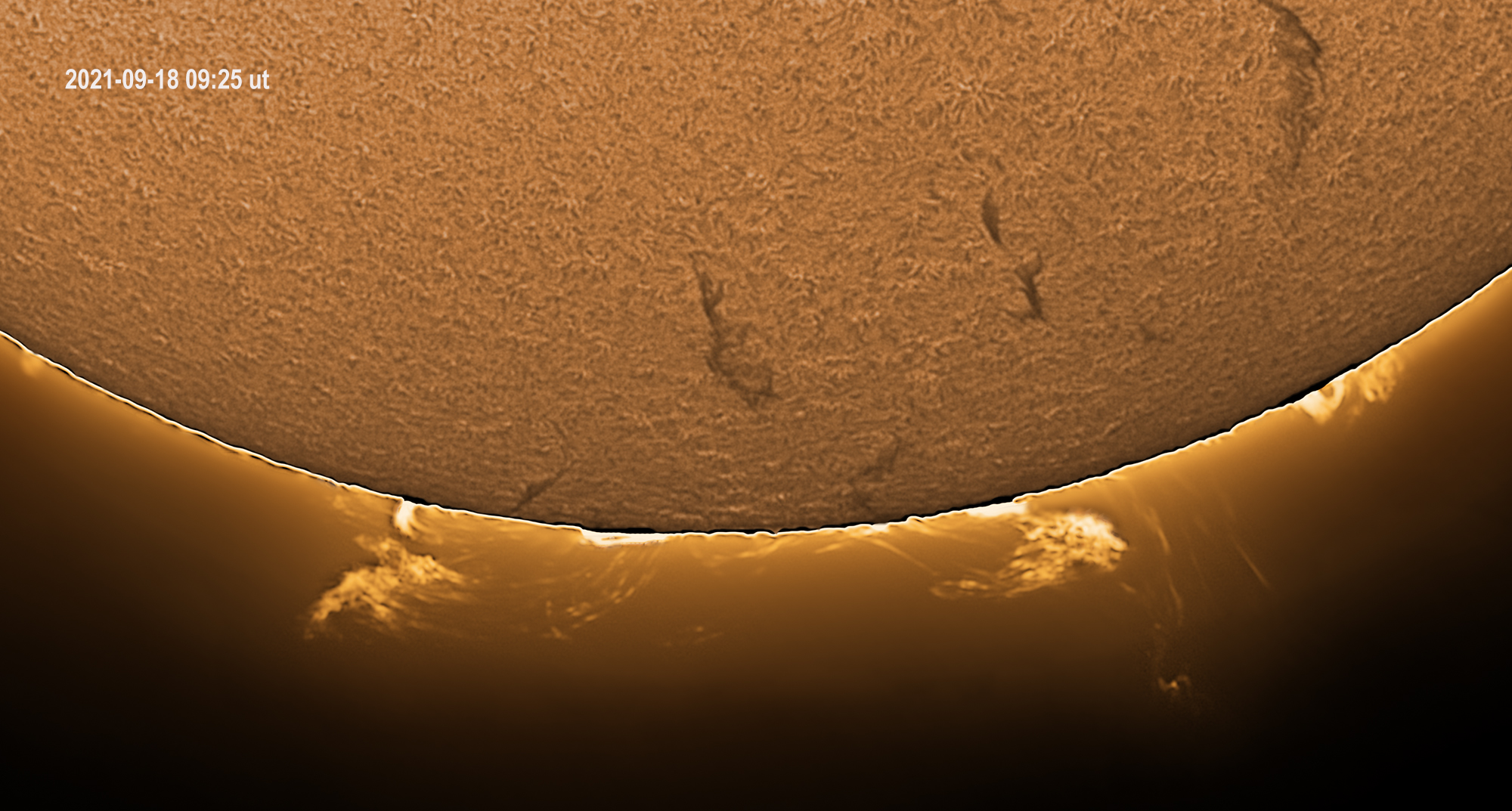 Am Südostrand der Sonne waren kleine aber helle Protuberanzen sichtbar. Die Feinstrukturen dazwischen waren aber viel weniger hell und sind erst durch die Bildbearbeitung ersichtlich geworden. Die Oberflächendetails sind mit einer kürzeren Belichtungszeit aufgenommen.