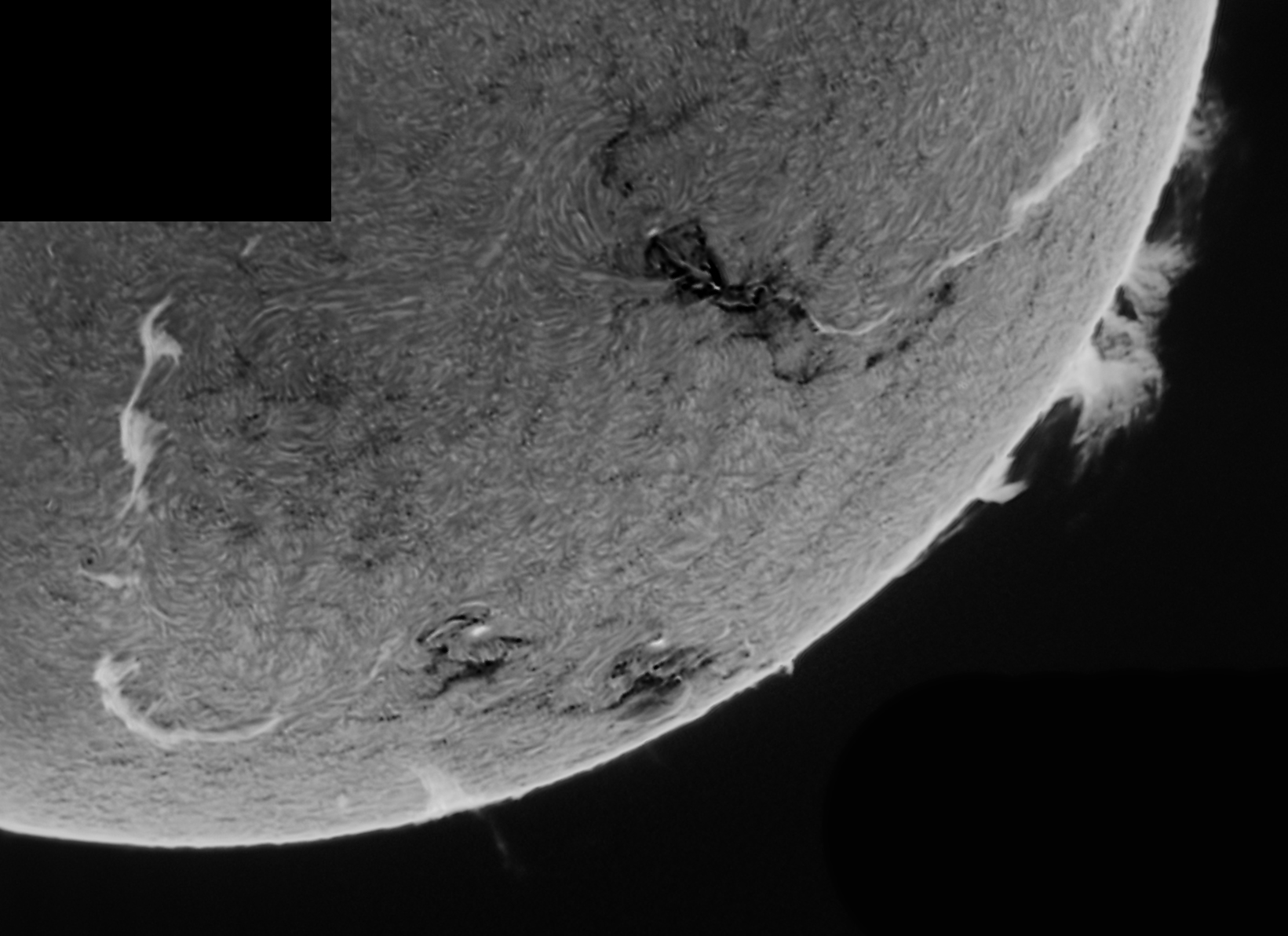 Sonne in H-alpha, Mosaik aus 2 Bildern, Sonnenoberfläche ist invertiert. An jenem Sonntag gab es auf der Sonne viel Interessantes zu sehen. Leider machte ein starker Jetstream das Seeing miserabel. :(