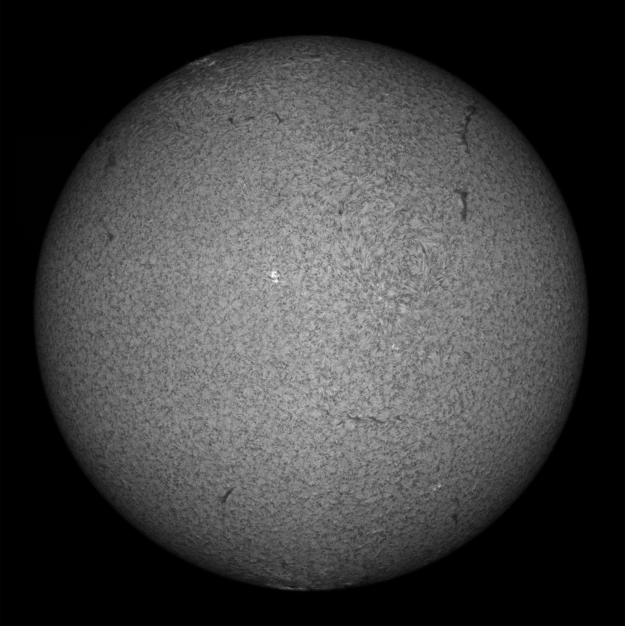 Ende Juni gelang mir dieses Mosaik aus sechs Teilbildern der Sonnenscheibe im H-Alpha-Licht. Leider war auf der Sonne zu diesem Zeitpunkt nicht allzu viel los, dennoch bin ich mit dem Ergebnis sehr zufrieden.