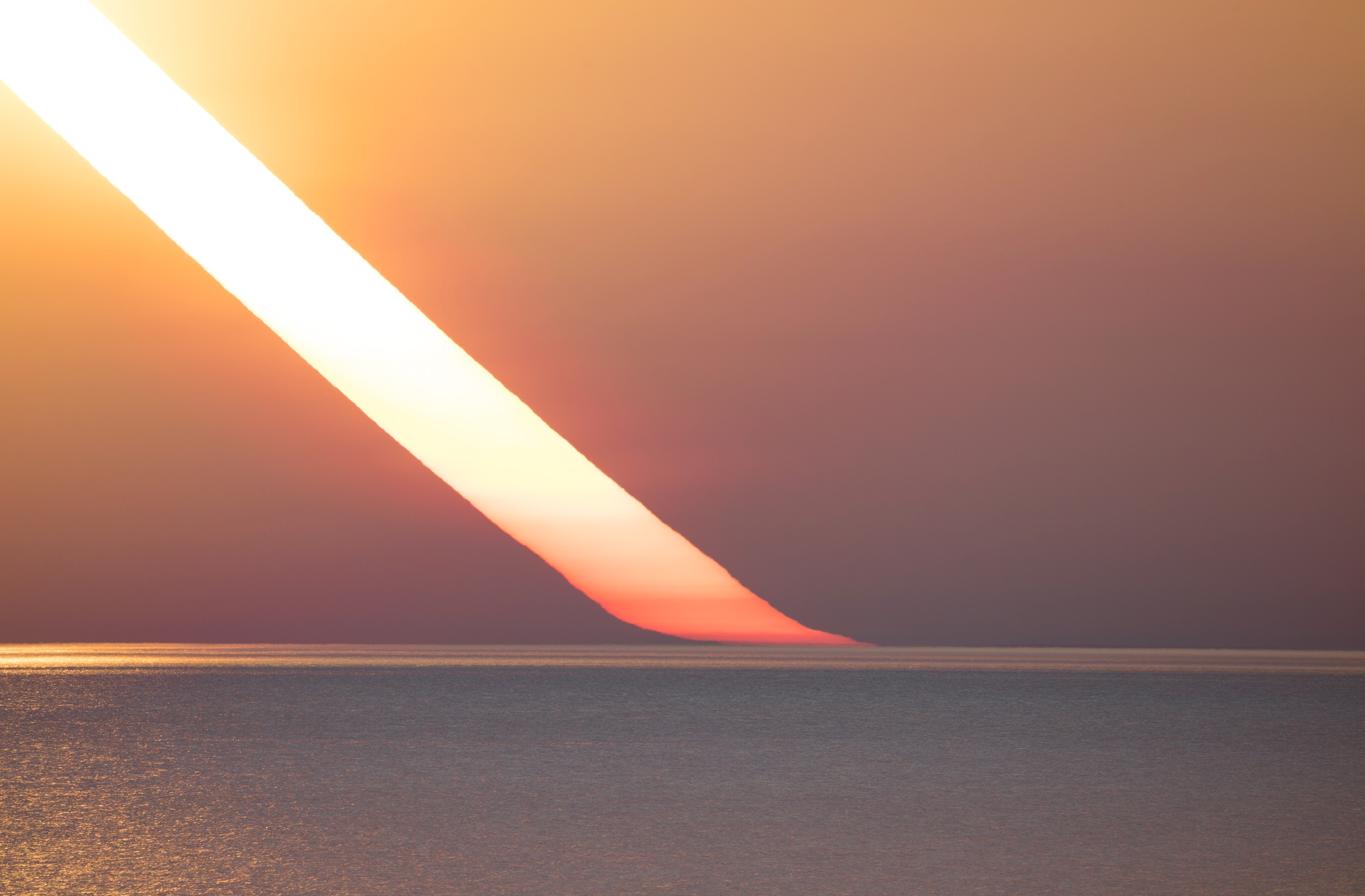 Eine Bildserie von 88 Aufnahmen mit jeweils 15 Sekunden Abstand, wurde zur einer Strichspuraufnahme kombiniert, um den Verlauf eines Sonnenuntergangs zu zeigen. Man kann gut erkennen, wie die Luftschichten die Leuchtkraft und die Farbe der Sonne ändert. Aber vor allem, wie die Atmosphäre die scheinbare Position der Sonne durch die Lichtbrechung verändert.