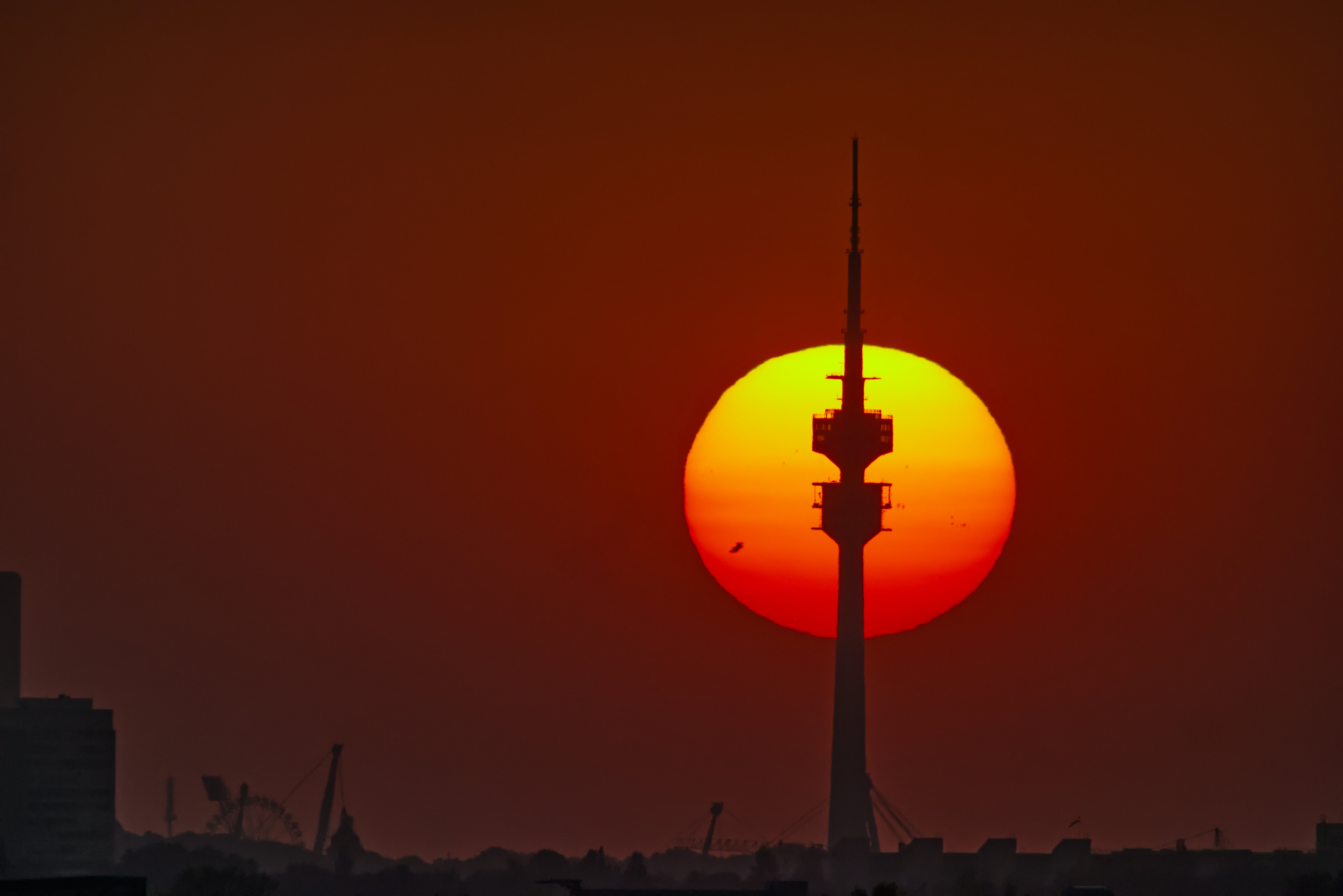 Zweimal im Jahr kommt es vor, dass die Sonne beim Untergehen vom Aussichtspunkt am Riemer See gesehen genau hinter der Restaurantplattform des Olympiaturms durchzieht. Einmal im Mai, wenn die Sonne sich auf ihrer jährlichen Bahn mit ihrem Untergangspunkt immer weiter nach Nordwesten bewegt, und einmal im August, wenn sich der Untergangspunkt wieder rückläufig Richtung Südwesten verschiebt. So auch heute, am 11. August 2025 um 20:27 Uhr. Dank der aktuell stabilen Schönwetterlage konnte ich zusammen mit anderen begeisterten Fotografen auf dem Riemer Aussichtshügel diesen Moment fotografisch festhalten. Der Olympiaturm ist etwa 13 Kilometer vom Riem entfernt, so dass die Sonne ungefähr den vierfachen Durchmesser der Aussichtsplattform zu haben scheint. Im Moment der Auslösung flog zufällig noch ein Vogel durchs Bild, so dass links unten auf der Sonne ein etwas größerer schwarzer Fleck zu sehen ist. Gleichzeitig sind rechts auf der Sonnenoberfläche mehrere kleinere Sonnenflecken zu sehen.