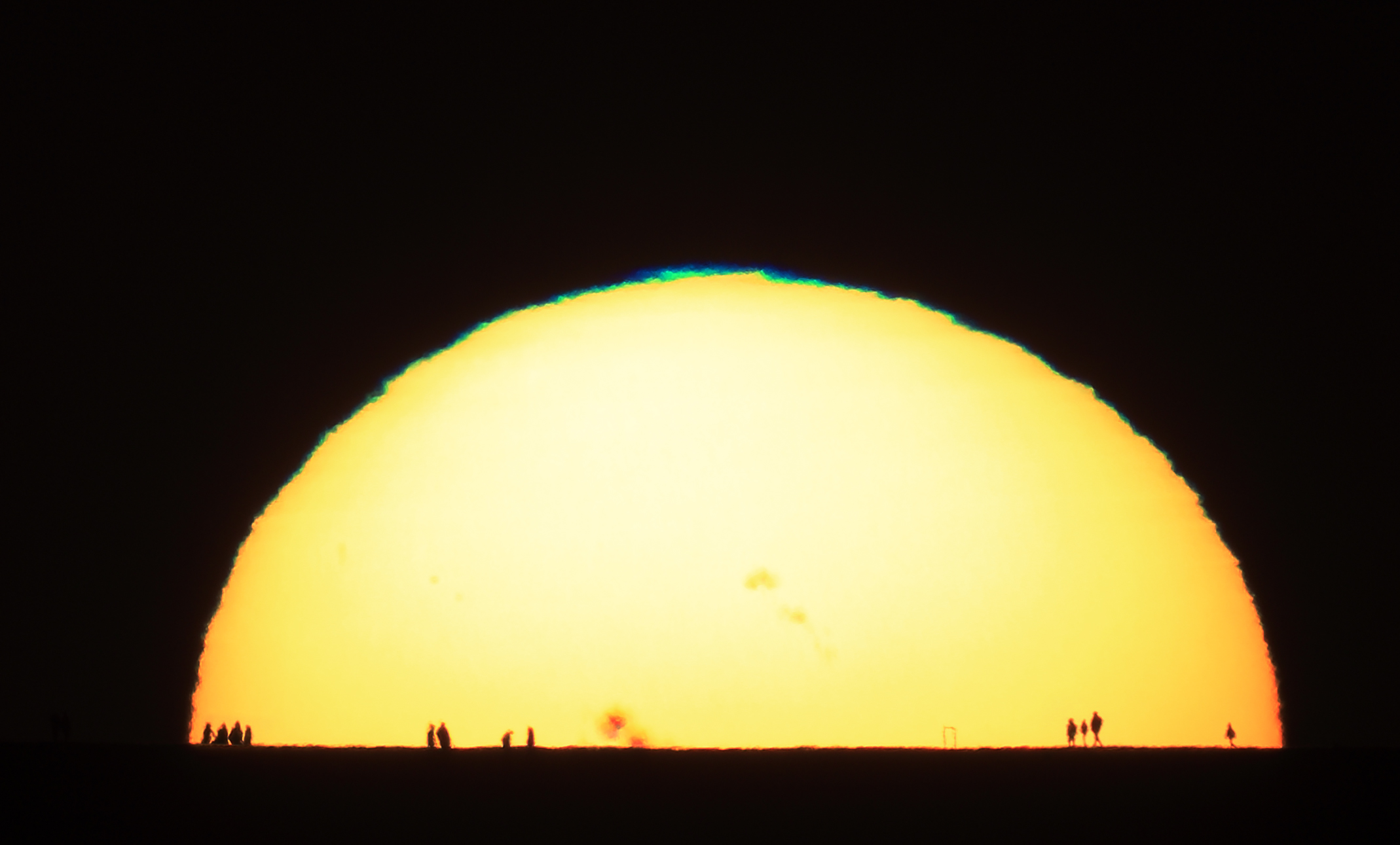 Das sehr schöne Wetter am 2.2.2014 hat mich dazu animiert astrofotografisch tätig zu werden. Bei uns in der Nähe ist das Horizontobservatorium auf der Halde Hoheward in Recklinghausen (näheres siehe unter http://www.horizontastronomie.de/). Durch eine Recherche im Internet wusste ich, dass von einem bestimmten Punkt aus die Sonne direkt neben dem Horizontobservatorium untergehen würde. Die Chance auf ein schönes Foto wollte ich nutzen und bin zu dem Platz gefahren. Leider ging die Sonne nicht direkt in einem der Bögen des Horizontobservatoriums unter. Zunächst dachte ich, es wäre ein Nachteil. Beim Fotografieren stellte ich aber fest, dass auf der Plattform des Observatoriums einige Personen unterwegs waren, die ich im Kamerasucher auch noch neben einer Sonnenfleckengruppe erkennen konnte. Dass dazu auch ein grüner, vielleicht sogar ein blauer Streifen am Sonnenrand zu sehen ist, hätte ich nicht gedacht.