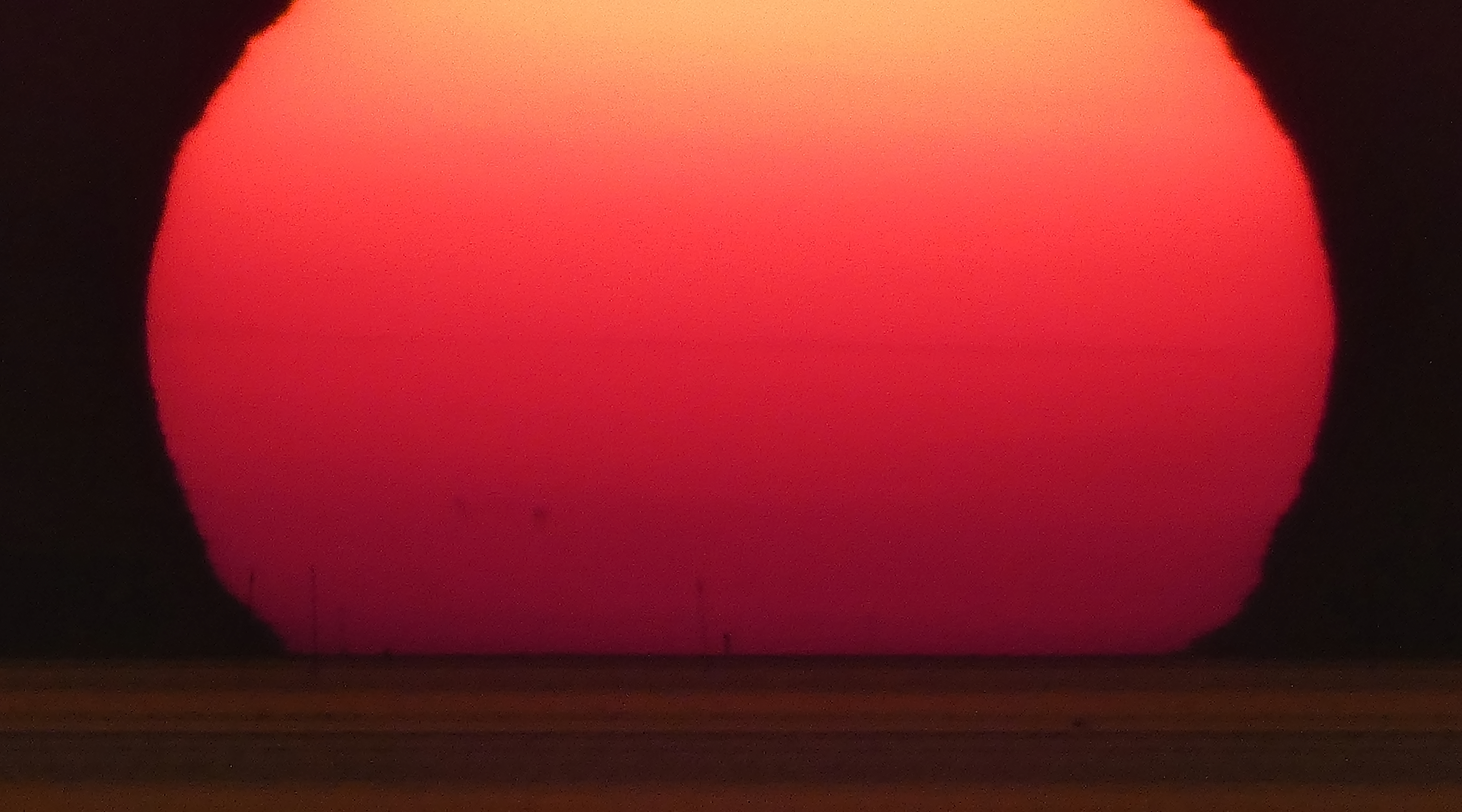 Ich war mit meinem Großneffen Fabian an den Nordseedeich nahe des Meldorfer Hafens in Dithmarschen (Schleswig-Holstein) gefahren, weil wir meine neue Kamera testen wollten. Ungewöhnllich für Datum und Uhrzeit war die große Menschenmenge, die auch den Deich hochstieg. Bis wir den gewaltigen Glutball der Sonne sahen, kurz vor dem Untergang. Zu sehen ist der Sonnenball hinter atmosphärischen Verzerrungen. Die dünnen, senkrecht stehenden LLinien sind Pricken, die das Fahrwasser in den Prielen weisen. Zum Zeitpunkt der Aufnahme herrschte auflaufendes Wasser bei 0 Windstärken. Sehr schön zu erkennen, auch ohne Teleskop und nur mit dem Kamera-eigenen Objektiv fotografiert, sind die beiden Sonnenflecken im linken unteren Quadranten.