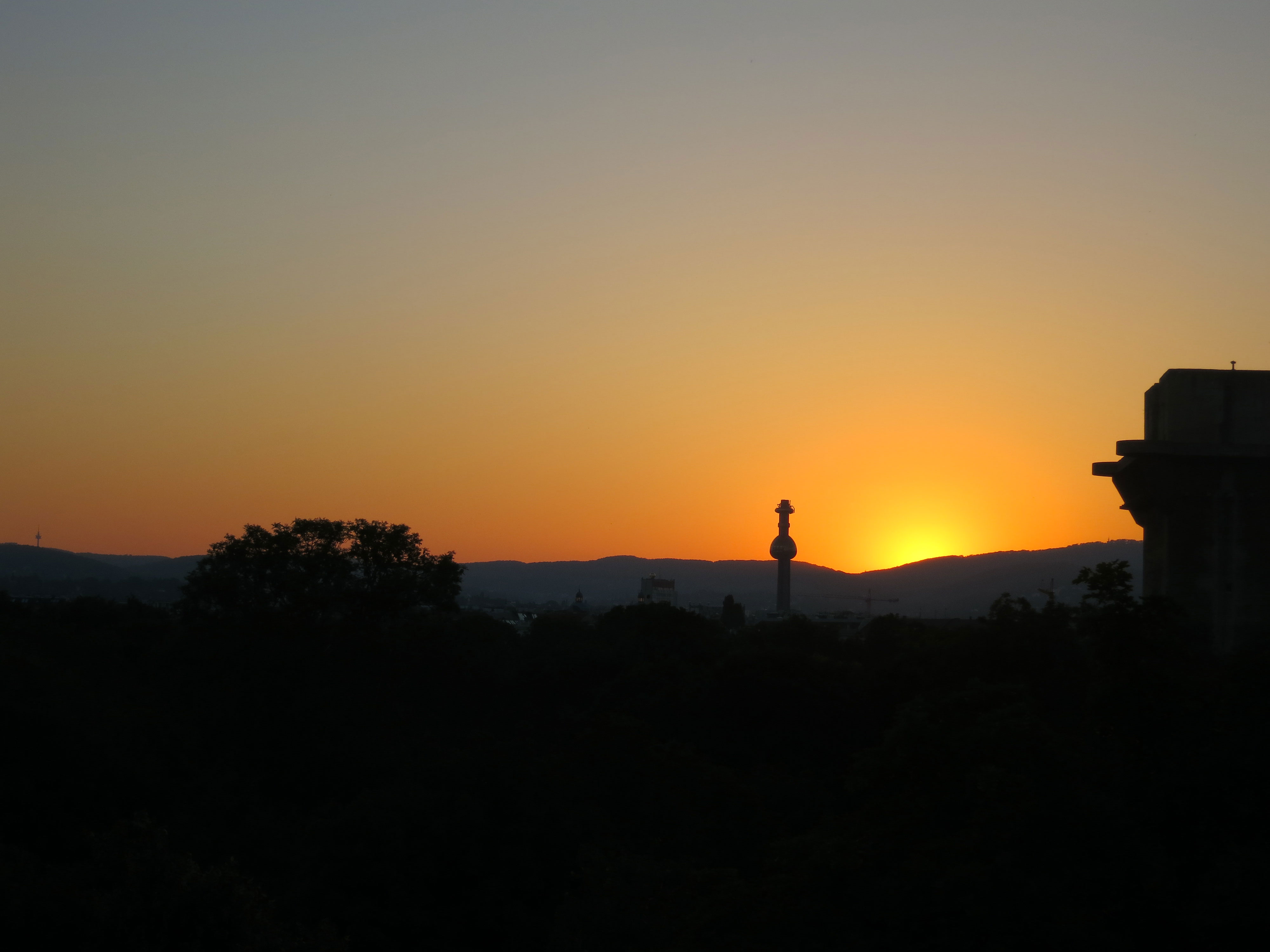 Sonnenuntergang über Wien am 5.6.2015, man sieht als Silouette den Flakturm des Augartens, das Fernheizwerk Spittelau mit der Hunderttwasserfassade und im Hintergrund Teile des "Kahlengebirge" einer Hügelkette im Wienerwald rund um Wien (max. 542m hoch)
