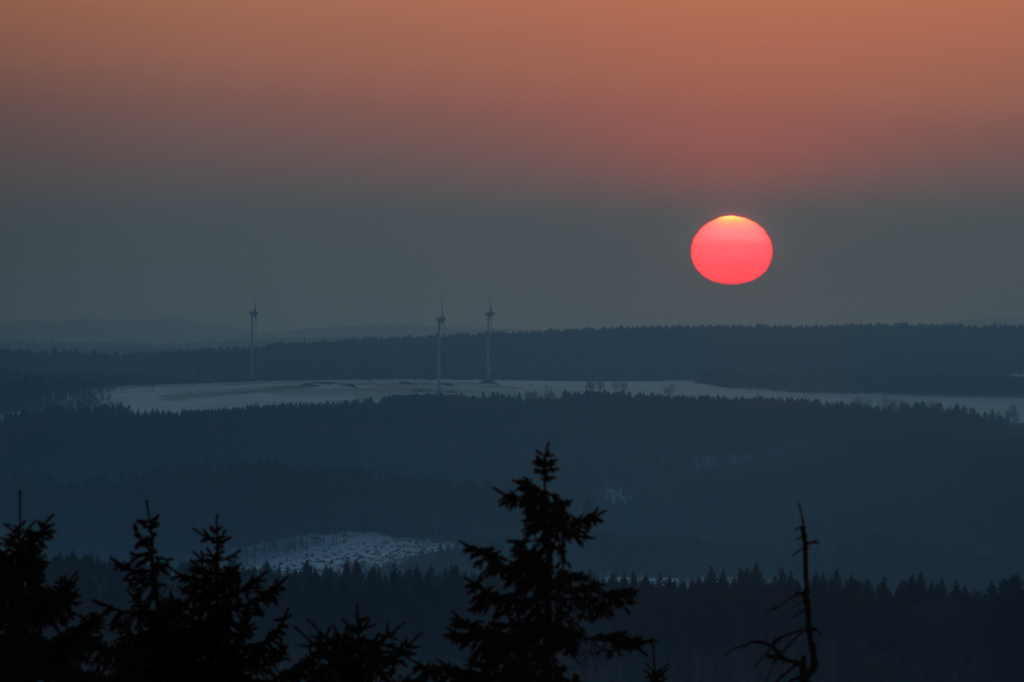 Stimmungsvoller Sonnenuntergang auf dem Kahleberg (905 m) bei Altenberg in Sachsen, direkt an der deutsch-tschechischen Grenze im Osterzgebirge. Primäres Ziel war eigentlich die Sichtung der nur 23h alten Mondsichel an diesem Abend, was aber trotz Fernglas als Aufsuchhilfe nicht gelang. Dafür bot der Dunst in Horizontnähe einen eindrucksvollen Sonnenuntergang.