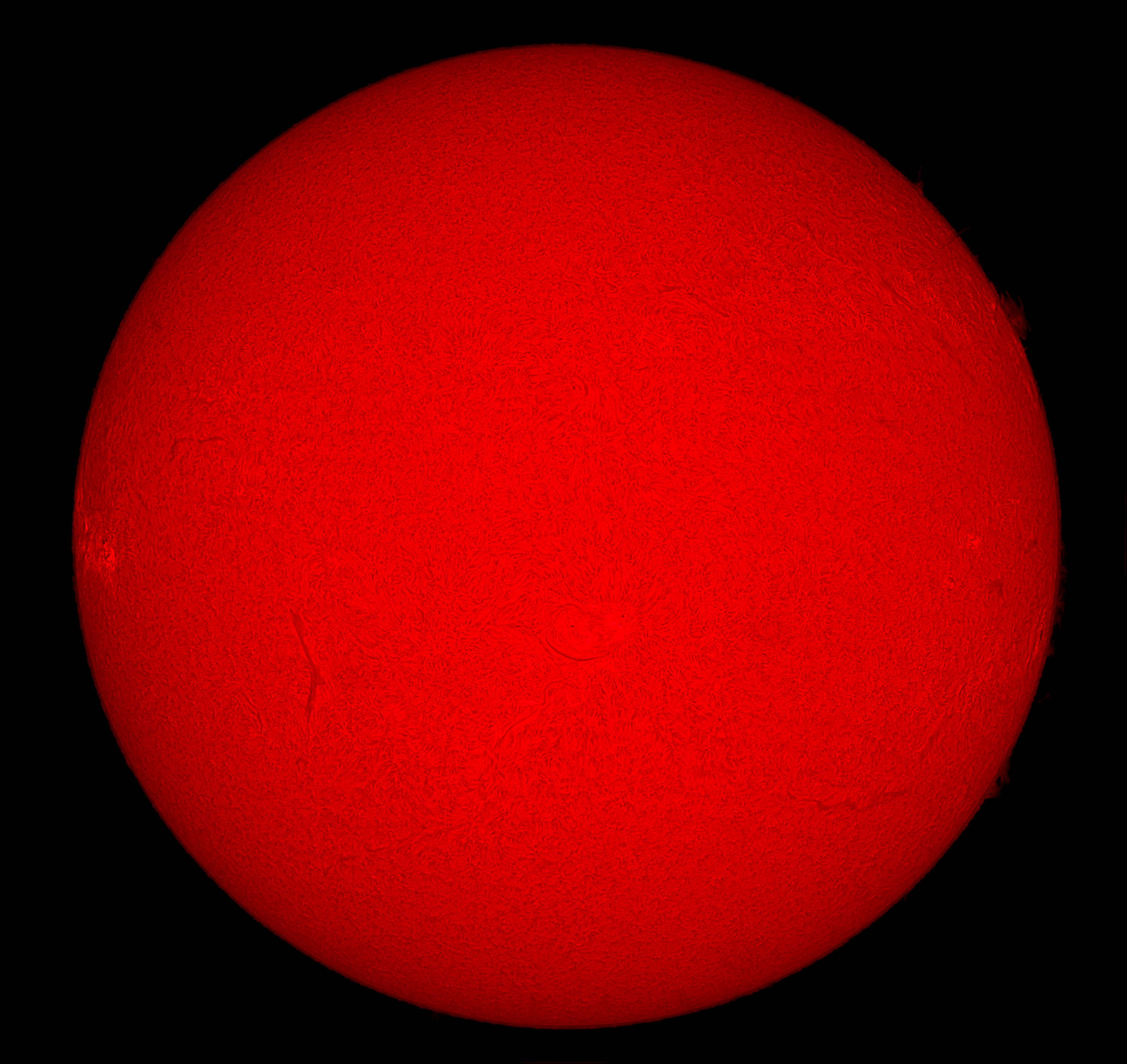 Ein heftiger Wind sorgte am Vormittag des Neujahrstags für wolkenlosen Himmel. Trotz der heftigen Luftbewegung war das Bild, das die Kamera auf den Monitor lieferte, erstaunlich klar. Die kleine Öffnung des Lunt-Teleskops von 60 mm verhält sich gegenüber den Luftbewegeungen gutmütig. Gegenüber meinen Aufnahmen kurz vor der Sonnenwende waren diesmal wenige Filamente zu sehen. In der Nähe der Bildmitte ist die aktive Region AR 13534 zu erkennen und am östlichen Sonnenrand schiebt sich die AR 13536 ins Bild. Der westliche Sonnenrand wartete mit interessanten Protuberanzen auf.