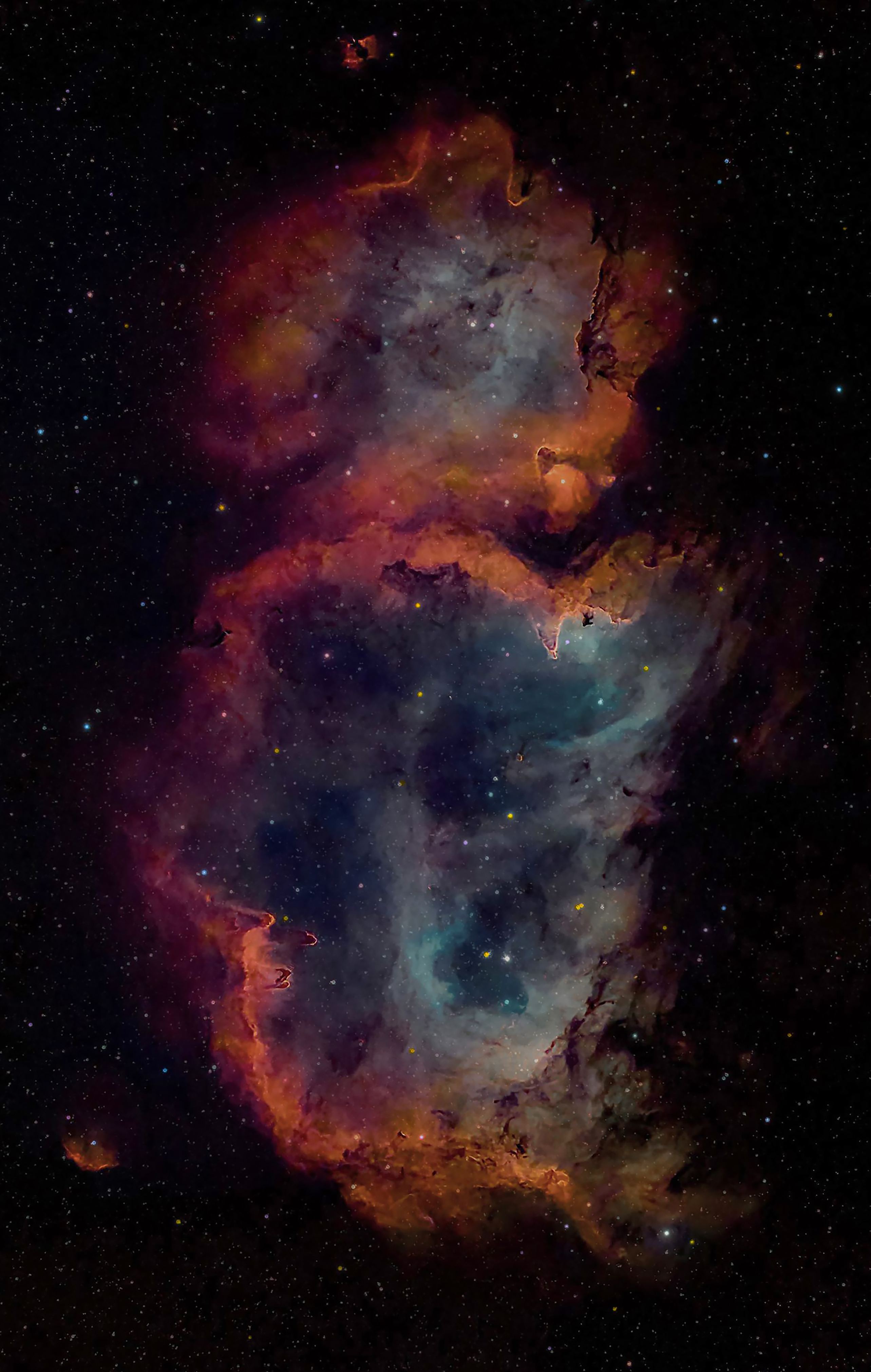 IC 1848 (bekannt als Seelennebel oder Embryonebel) ist aufgrund seiner charakteristischen Form, die ihn einem menschlichen Fötus ähneln lässt, ein diffuser Nebel, der mit einem offenen Sternhaufen junger, heißer Sterne mit großer Masse verbunden und im Sternbild Kassiopeia zu sehen ist. Seine Entfernung wird auf 7600 Lichtjahre von uns geschätzt, und er erstreckt sich über etwa 100 Lichtjahre. Sein Gas wird von blauen Riesensternen beleuchtet, die aus den Gasen des Nebels entstanden sind. Das Licht wird dann vom Nebel in der typischen Farbe der Emissionslinien von Wasserstoff zurückgestrahlt.