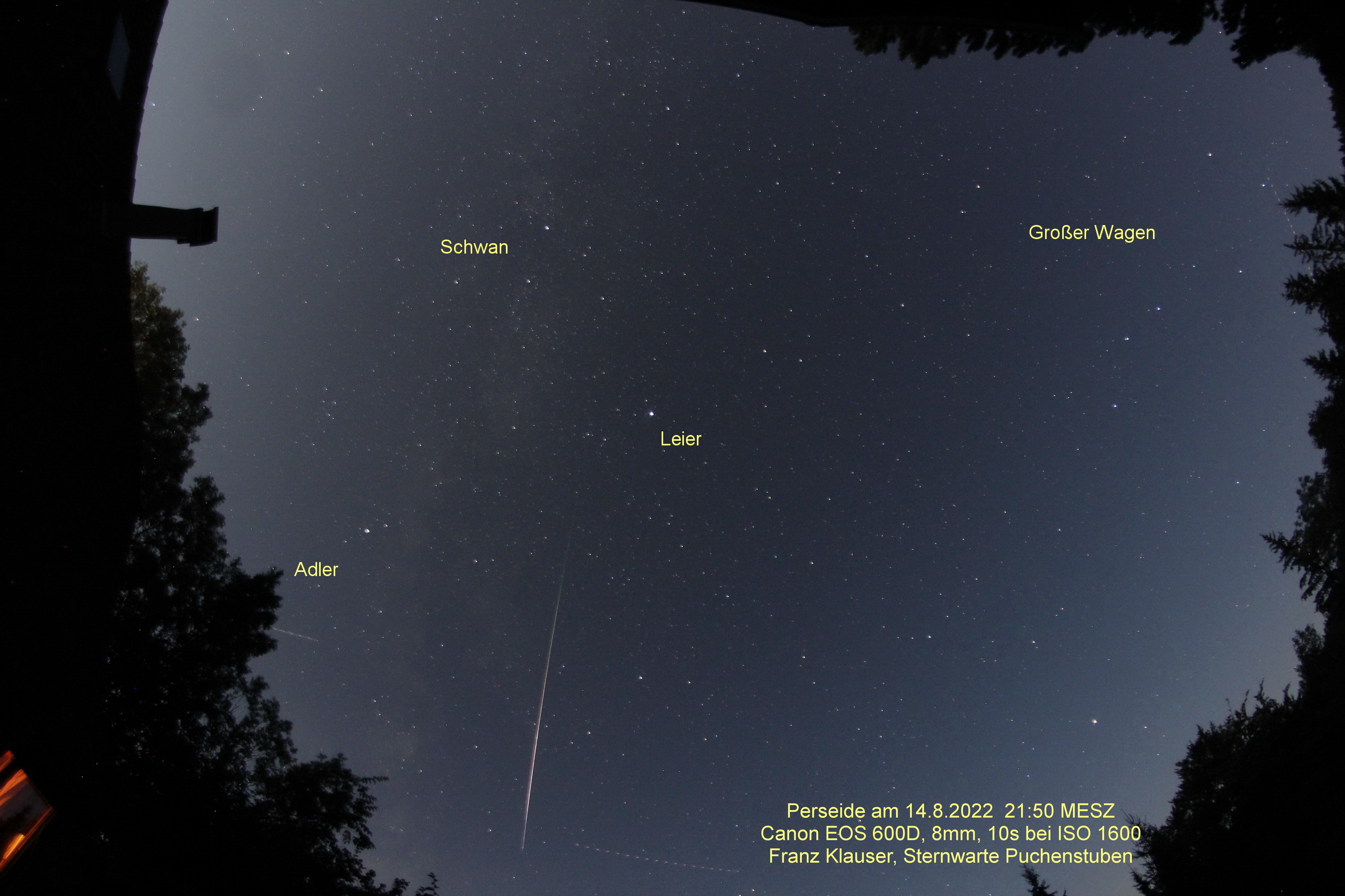 Die Perseiden mit ihrem Höhepunkt um den 12. August jeden Jahres haben einen Aktivitätszeitraum von Mitte Juli bis Ende August. In einer Aufnahmeserie mit dem 8mm Weitwinkelobjektiv fand sich dieser schöne Treffer einen Tag nach dem Perseidenmaximum.