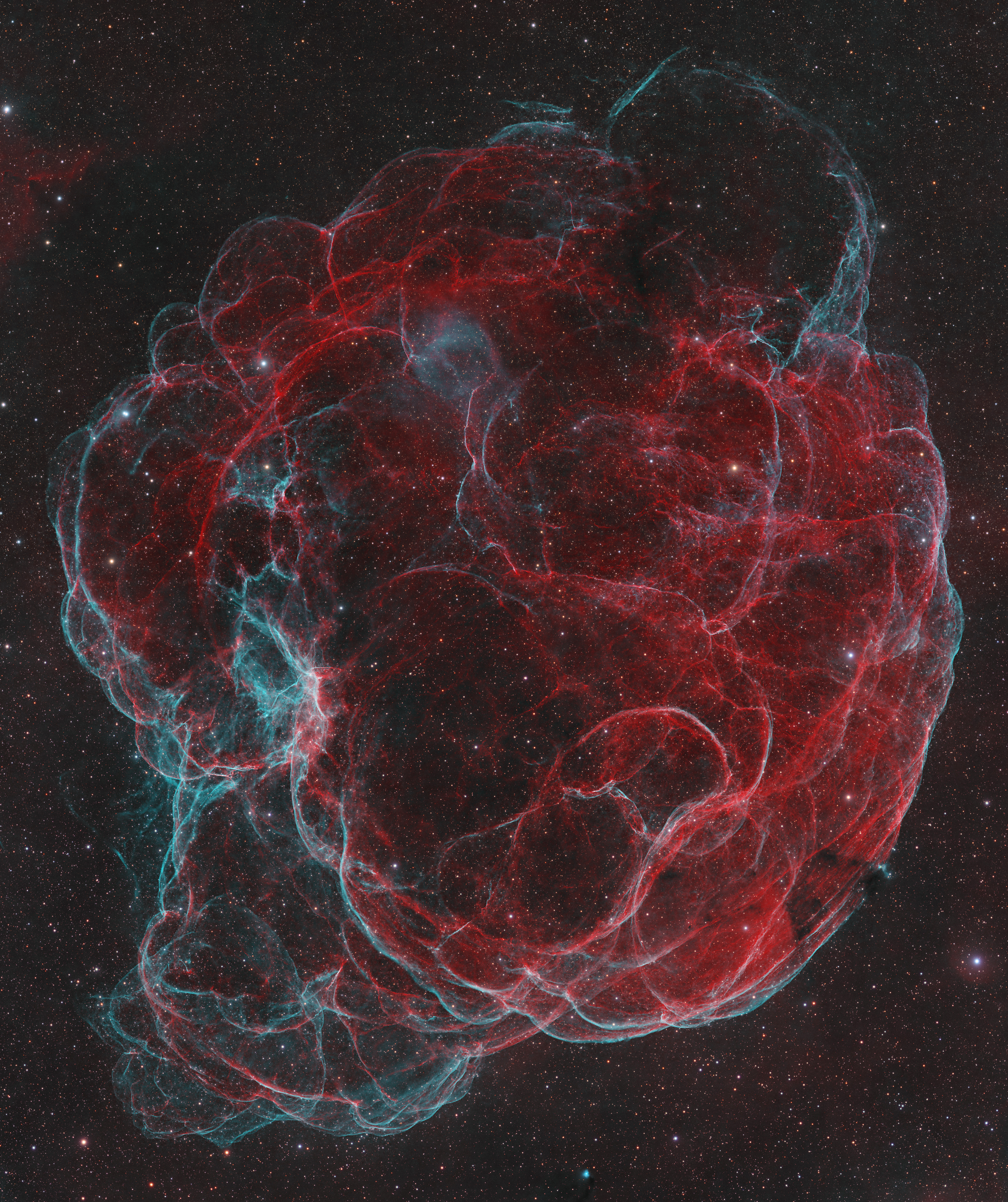 Manchmal dauert es etwas länger. Was im Jahre 2021 als nicht erfolgreicher Versuch mit einer Farbkamera begann, konnte ich Ende 2023 endlich abschließen: Ein Mosaik aus zwei Bildfeldern des Spaghettinebels, aufgenommen während 16 Nächten mit insgesamt 45 Stunden Belichtungszeit. Mein bisher längstes Astrofotoprojekt ist eine Ausarbeitung in HOO-Palette mit Sternen in RGB.