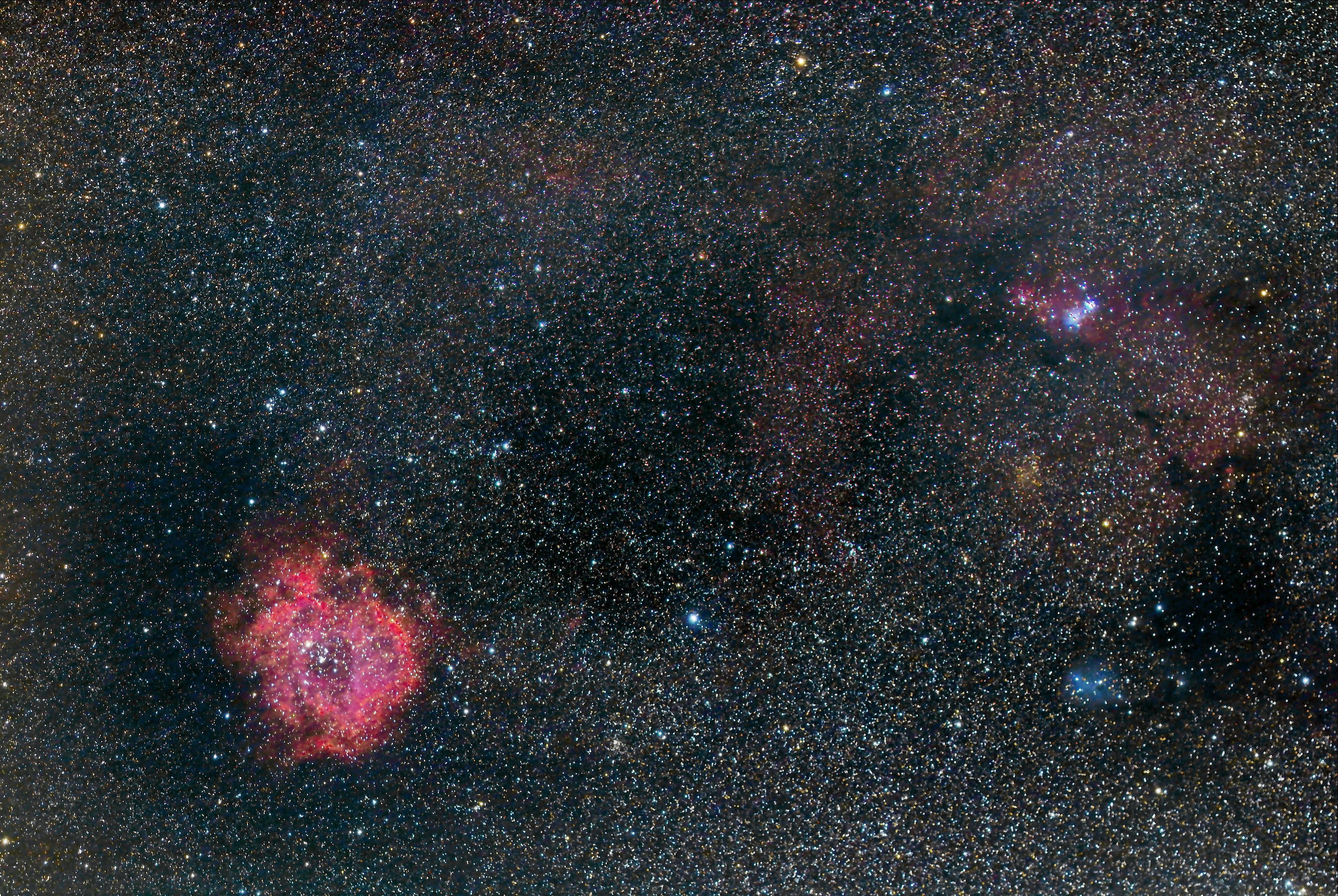 Ein herrliches Gebiet inmitten der Wintermilchstraße mit vielen Objekten. Allen voran der Rosettennebel, aber auch der Weihnachtsbaumhaufen mit dem Konusnebel und der hübsche Reflektionsnebel IC 447 sind einen Blick wert. Ganz winzig ist sogar Hubbles veränderlicher Nebel zu erahnen.