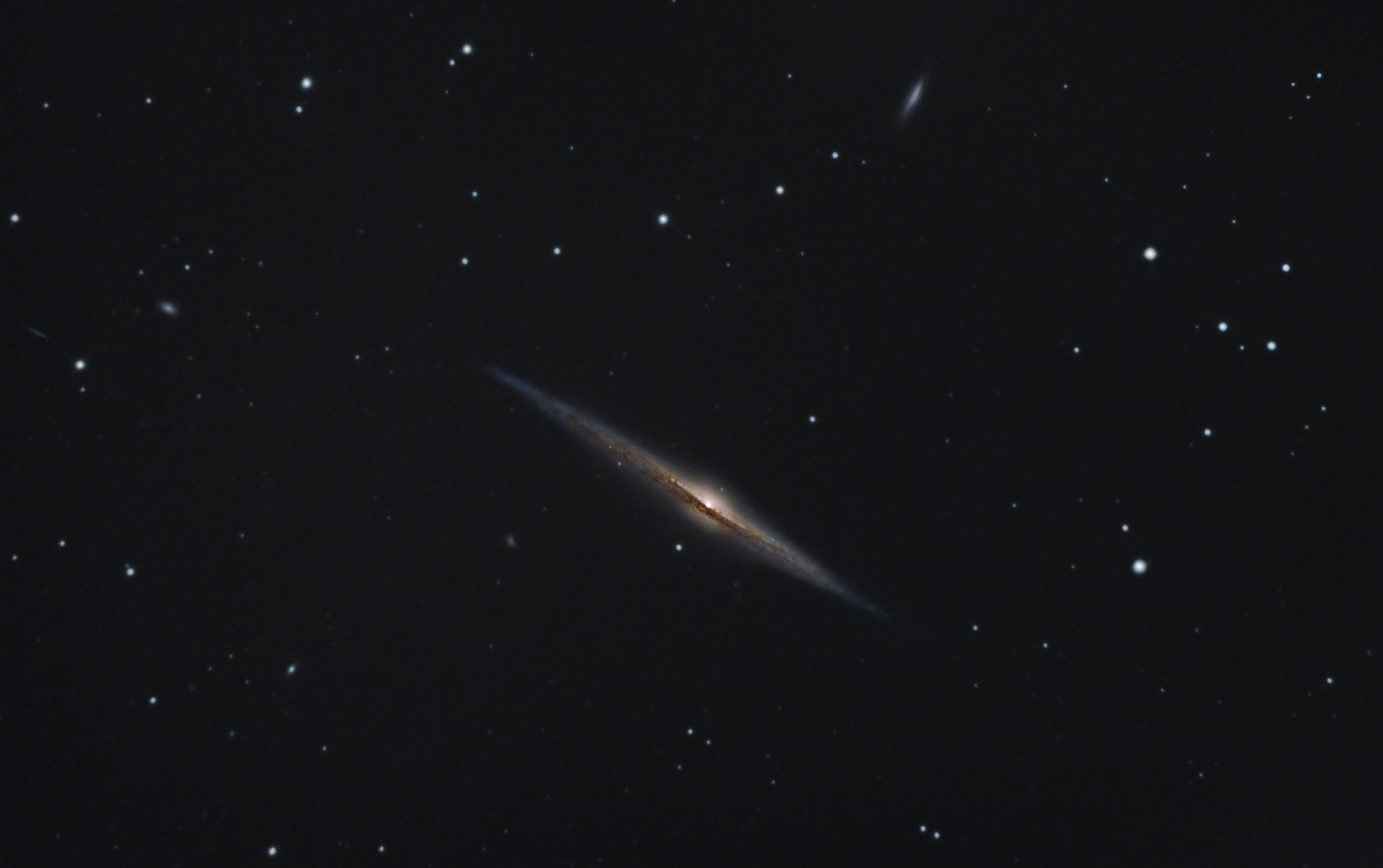 Die Spindelgalaxie NGC 4565 ist eigentlich eine Scheibe. Sie liegt allerdings in einem schrägen Winkel zu uns, so dass wir sozusagen von der Seite auf sie schauen. Die Entfernung beträgt circa 30 Millionen Lichtjahren. An den Rändern lässt sich eine leichte "Biegung" erkennen, die durch die Rotation der Scheibe entsteht.