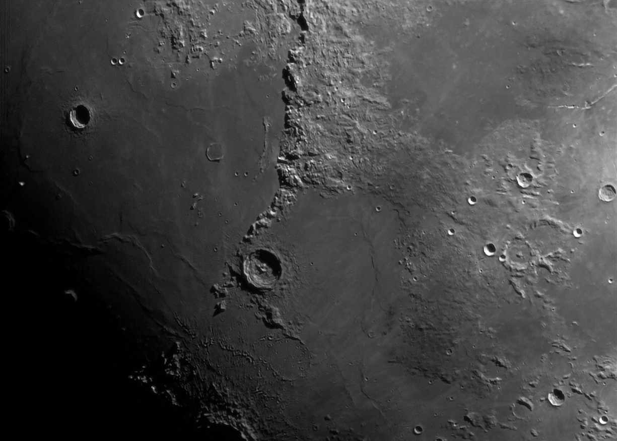 Am gestrigen Abend war es endlich möglich, mit dem OMC 140 deluxe Aufnahmen zu machen, die ein gutes Ergebnis brachten und die Leistungsfähigkeit dieses doch relativ kleinen Systems ausnutzten. Die Vielzahl der kleinen Krater bei Stadius ist gerade bei diesem Schattenwurf schön zu sehen.