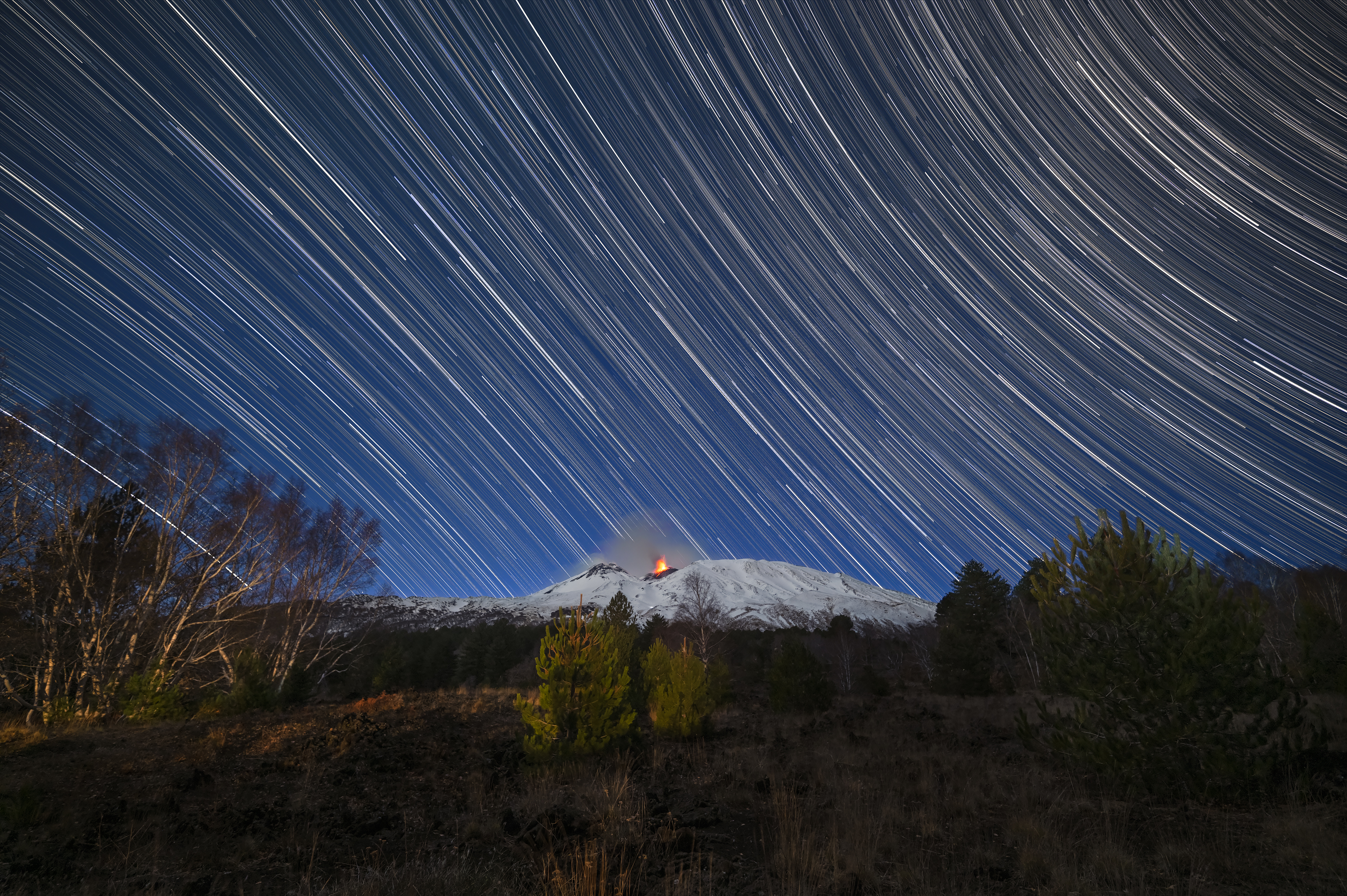 This image is generated from 425 shots of star trails above the erupting Etna volcano. A blanket of pure white snow reflects the moonlight and contrasts with the red of the volcano's lava.