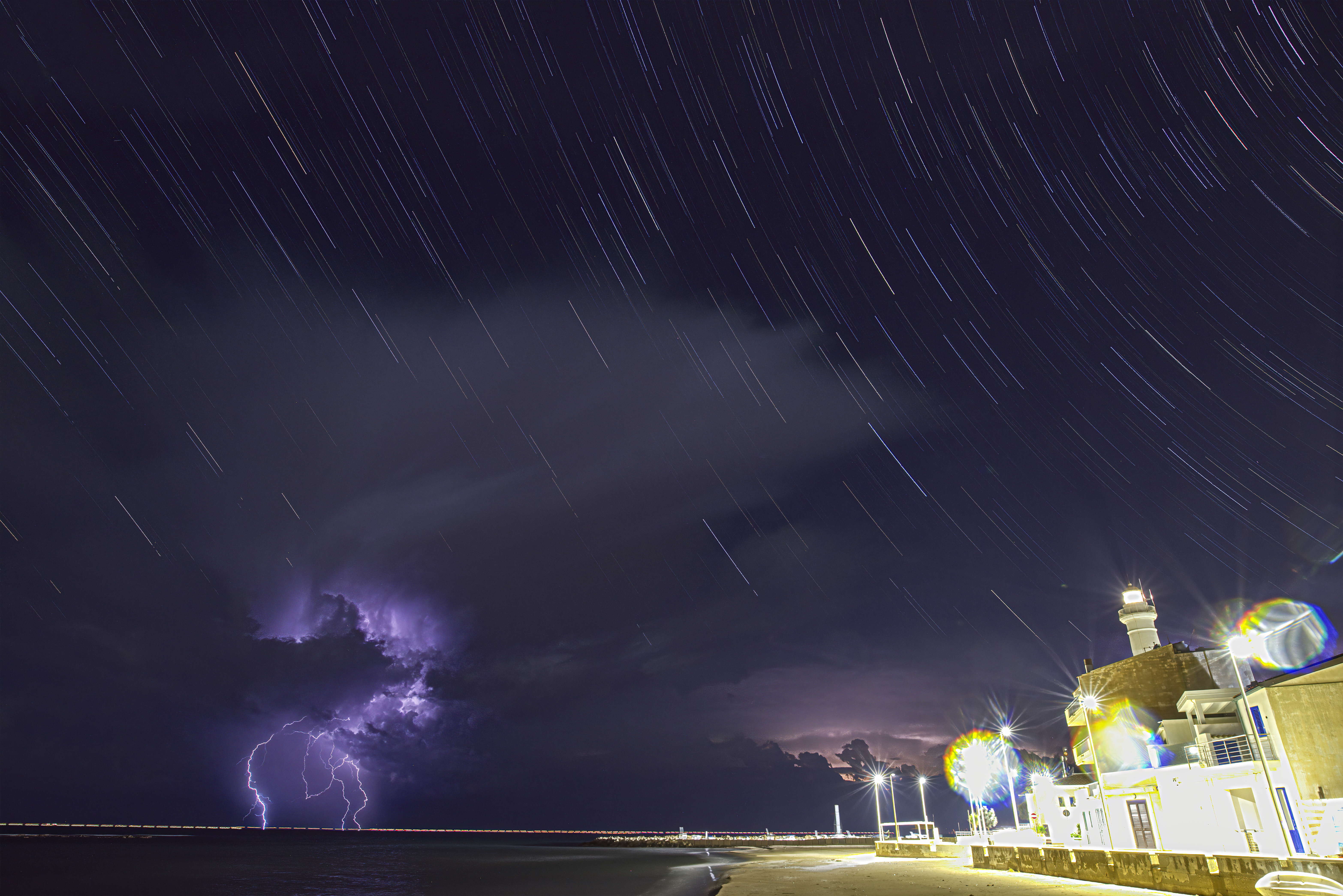 Leserbilder Astronomie: Star trails versus lights, lighthouse and lightning