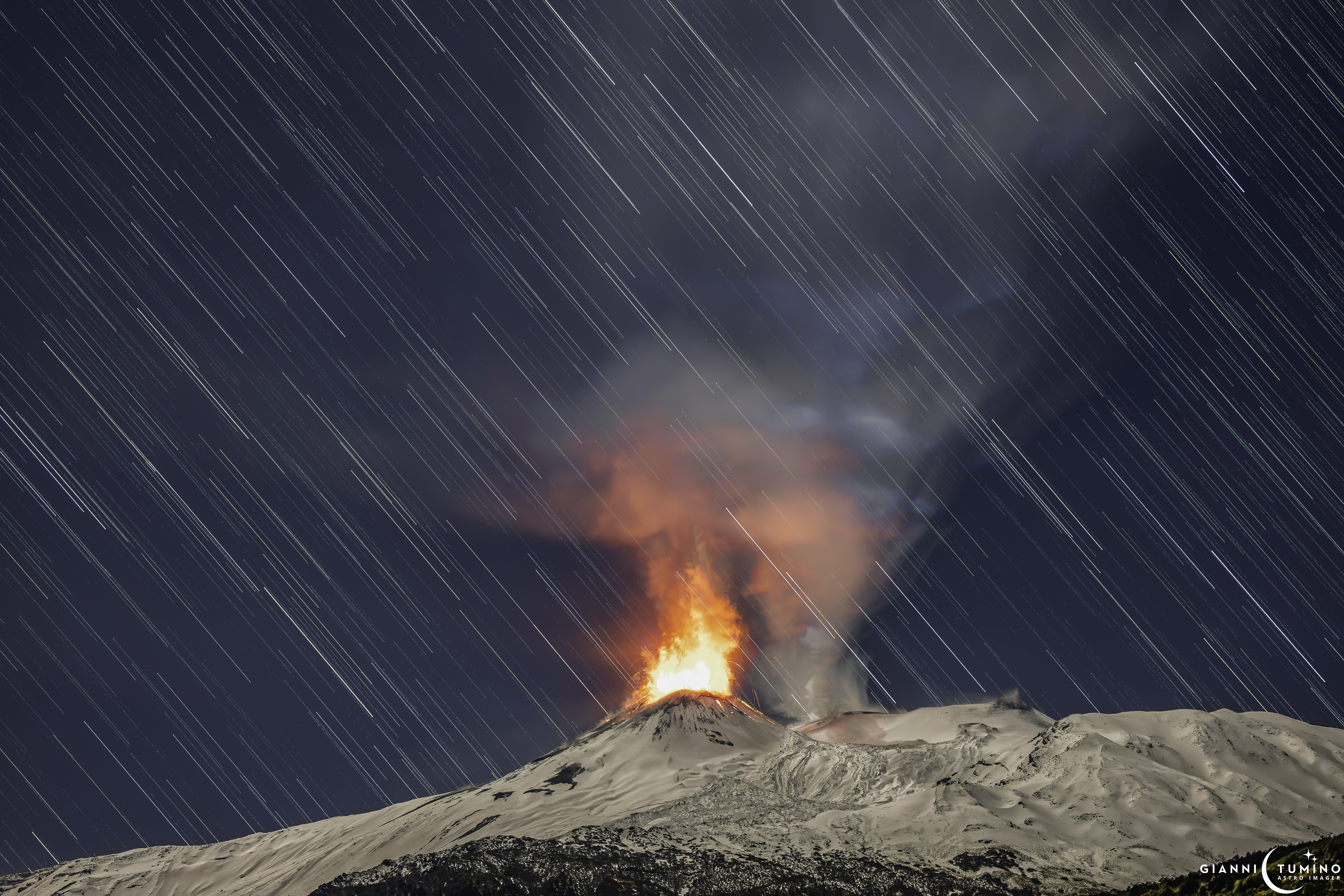 Star trails over erupting Etrna on November 24, 2023