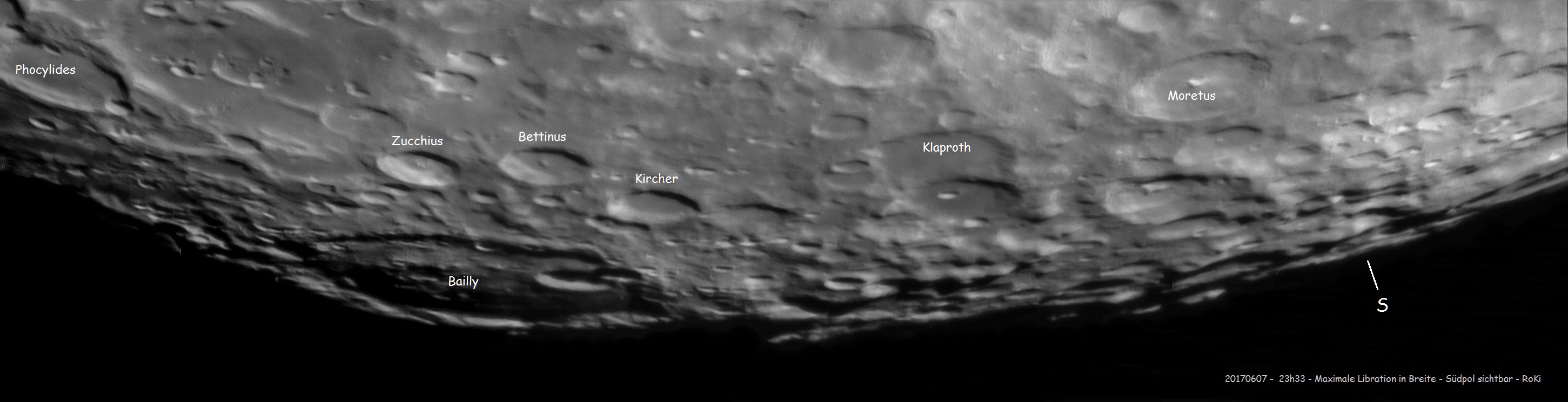 Am 7. Juni betrug die Libration – 6,604" in Breite und durch dieses scheinbare Kippen konnte man über den Südpol hinweg sehen. Dieses Bild ist eine Komposition von 3 Aufnahmen mit dem ETX 125 und Powermate 2x.