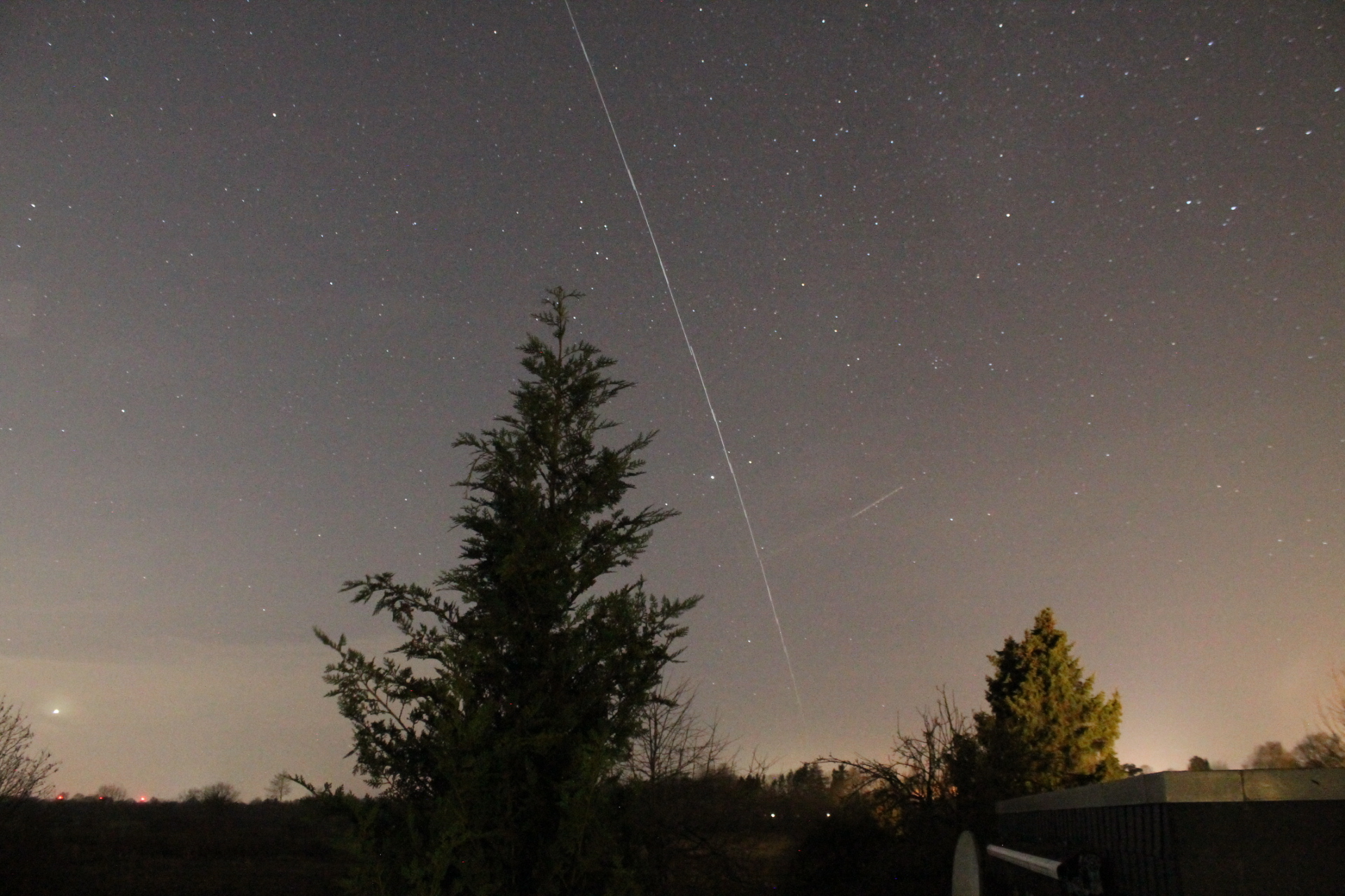 Am frühen Silvesterabend war der Himmel über Schleswig-Holstein erfreulich klar, so dass man am westlichen Himmel eine auffällige »Perlenkette«, wie mit dem Lineal aufgereiht, in regelmäßigen Abständen bewundern konnte. Die Sterne stiegen in absolut gleichmäßiger, langsamer Geschwindigkeit auf. Diese vermeintlich mysteriöse Himmelserscheinung war auf eine Reihe Starlink-Satelliten der Firma SpaceX des Amerikaners Elon Musk zurückzuführen. Am linken Bildrand ist die Venus, zentral sind Adler und Delfin, rechts oben ist die Raute der Leier zu erkennen.