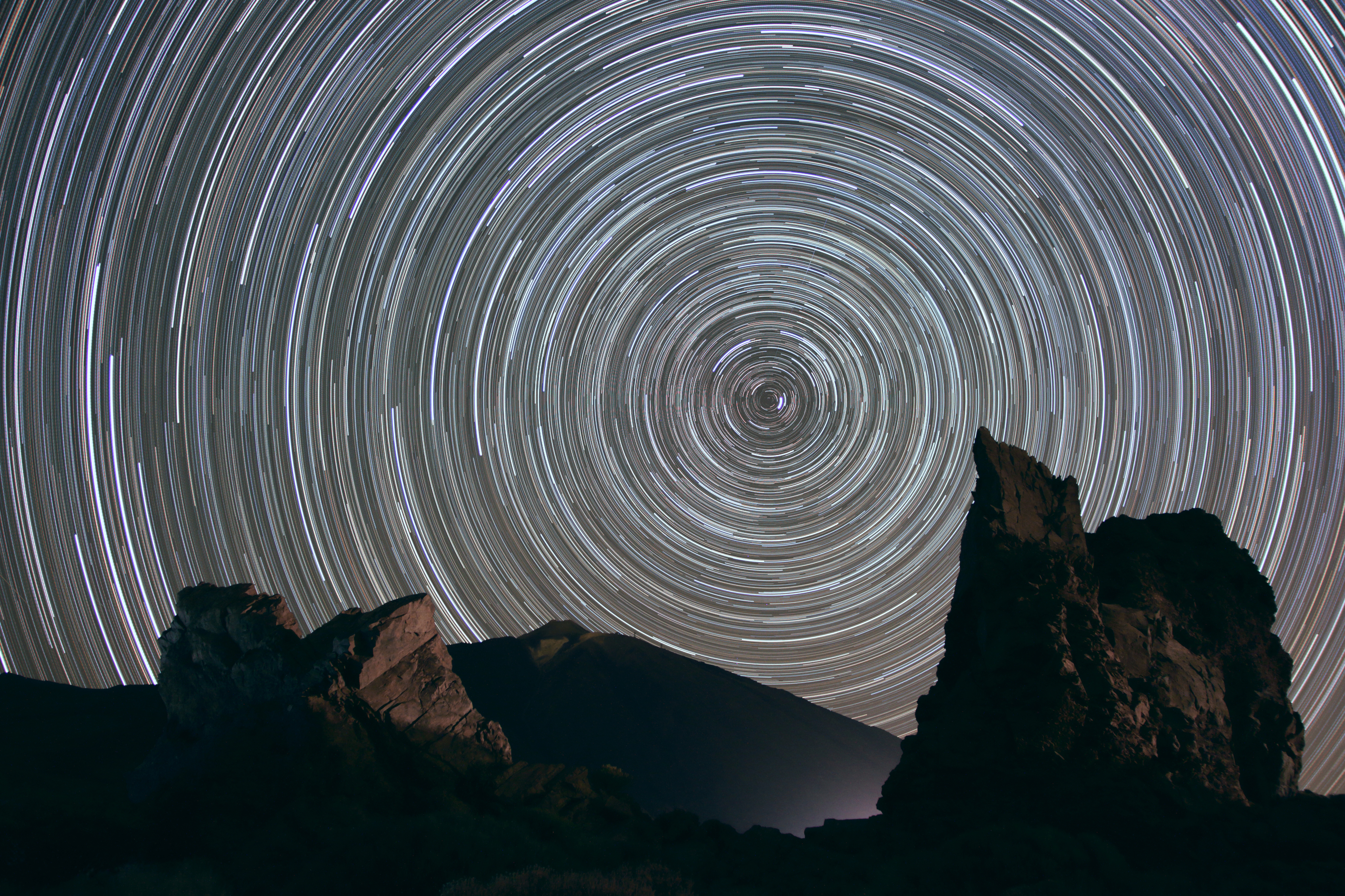 Durch die südlichere Lage steht auf Teneriffa der Himmelspols nur 28 Grad über dem Horizont. Die Aufnahme entstand im Teide-Nationalpark, unweit der Roques de Garcia. Die Felsen werden durch entfernte Autos etwas beleuchtet, der Lichtschein dahinter stammt von der Straße und gibt den Felsen Kontur. Belichtet wurde 160 mal 60 Sekunden mit 5 Sekunden Unterbrechung, verarbeitet mit startrails und PS.
