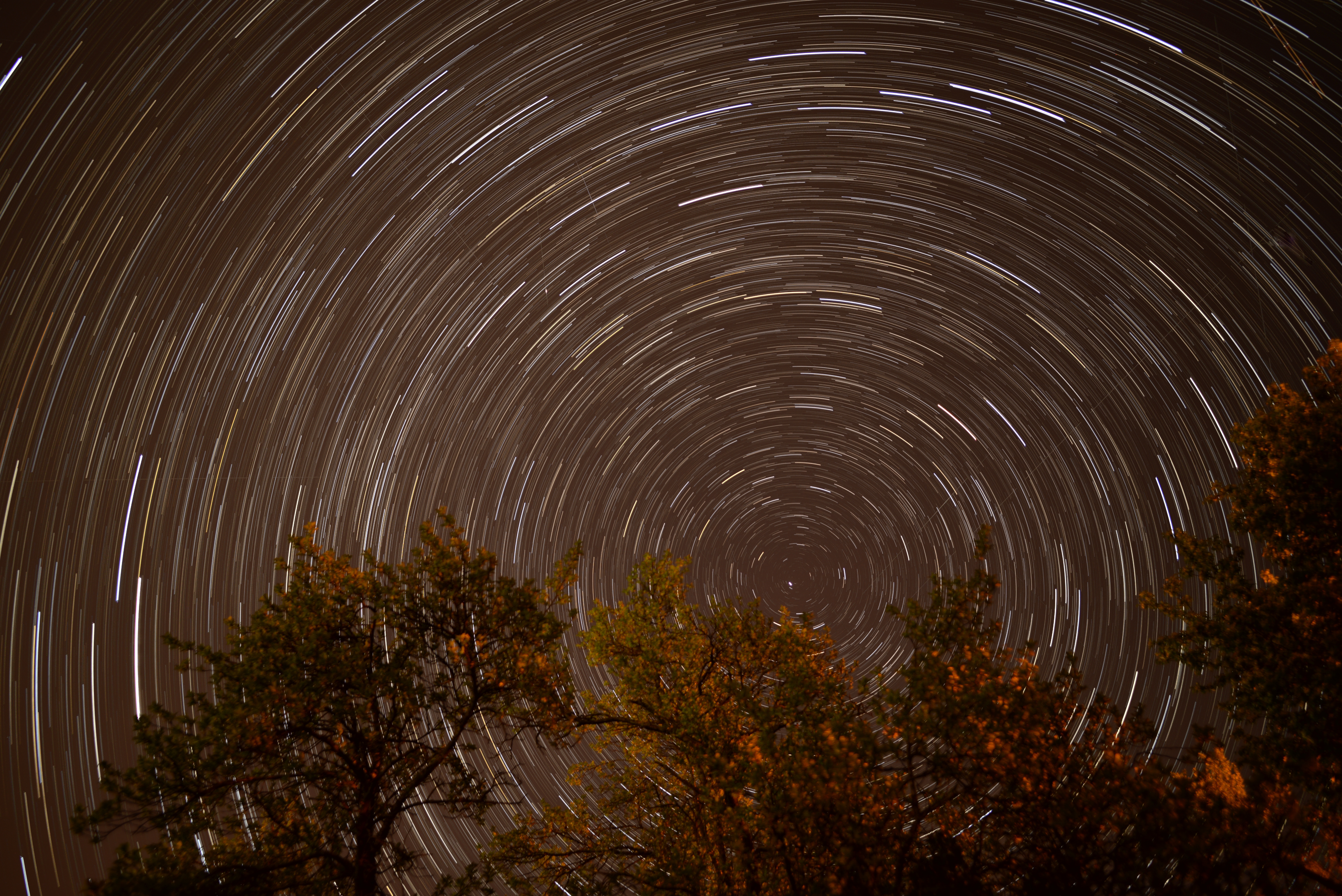 Einzelbilder im heimischen Garten aufgenommen und zu Startrails zusammengefügt. Insgesamt wurden 79 Einzelaufnahmen verwendet.