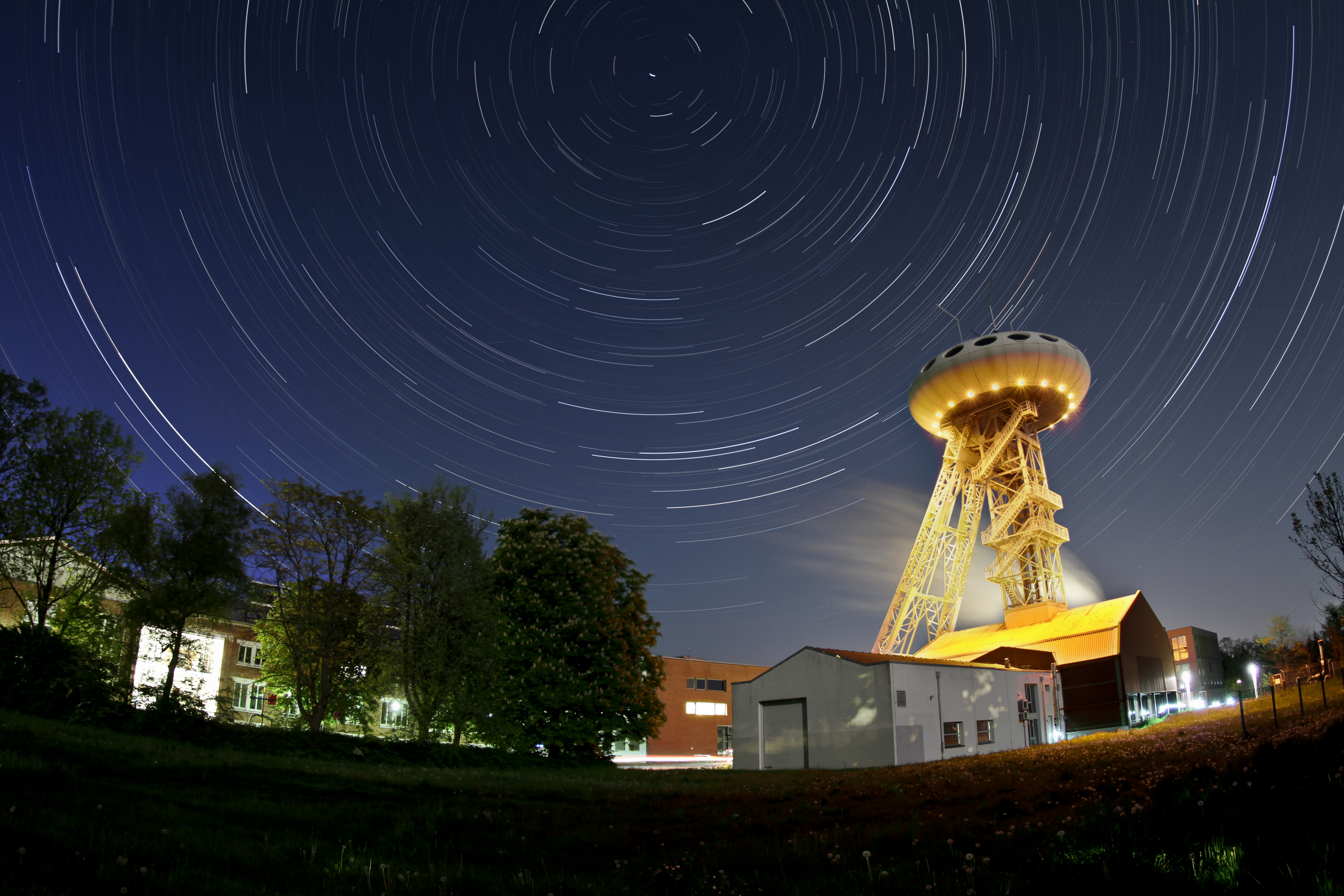 Stark vom Licht verschmutzt zeigt sich unser Ruhrpott. Ich dachte, da kann das Licht vom Vollmond nicht mehr viel schaden. Das UFO ist gelandet. Auf einem alten Förderturm der Schachtanlage Minister Achenbach in Lünen-Bambauer. 22 Jahre steht es dort schon … Schon lange hegte ich den Wunsch, diese Szenerie mit Startrails aufzunehmen. In der Nacht vom 10. auf den 11. Mai war es dann so weit. Vor Ort war ich dann etwas ernüchtert. Nach Einbruch der Dunkelheit zeigten sich visuell nur ein paar Sterne. Ich musste Gewissheit haben, ob etwas geht und legte los. 397 Einzelaufnahmen mit und ohne Beleuchtung des Colani-Eis kamen zusammen. Alle Aufnahmen wurden 20 Sekunden lang belichtet, bei ISO 100.