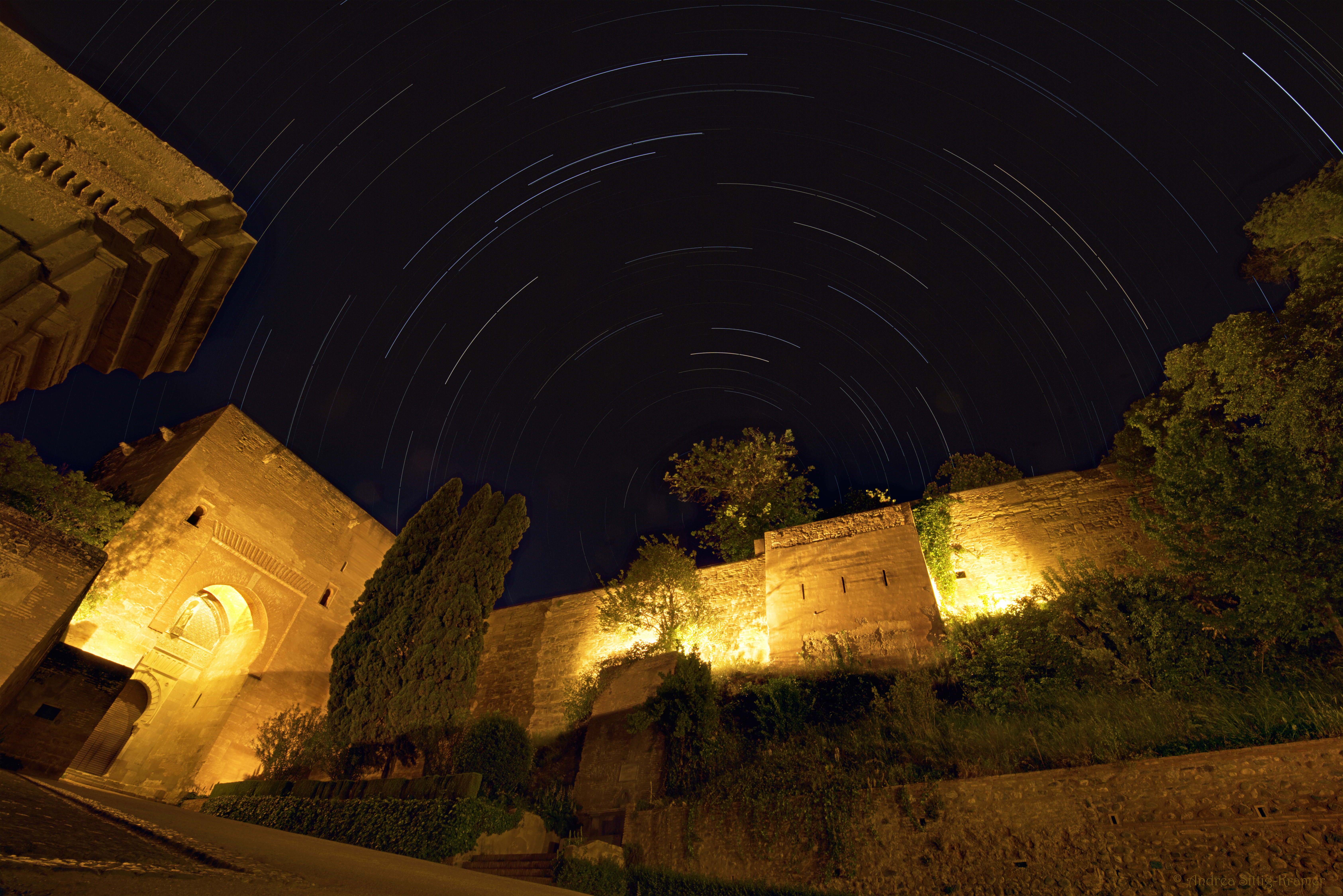 Anfang Mai erfüllte ich mir einen lang gehegten Traum: Ich besuchte die Alhambra in Granada, Spanien. Nach der Besichtigung der maurischen Stadtburg aus dem 13./14. Jahrhundert suchte ich einen Standort, um ein Sternenstrichspuren-Bild zu fotografieren. Geeignet erschien mir der Platz vor dem »Puerta de la Justicia« (das »Tor der Gerechtigkeit« - links im Bild) außerhalb der Roten Festung. Die Außenmauern waren wunderschön illuminiert und ab Mitternacht war niemand mehr unterwegs an der tagsüber sehr stark besuchten Touristen-Attraktion. Von meinem Standort aus konnte ich den Polarstern in der Mitte des Bildes platzieren und der fast volle Mond kam noch nicht ins Bild. Bei genauer Betrachtung der Sternspuren fällt auf, dass alle Striche an der gleichen Stelle eine kleine Lücke haben: Um 01:30 Uhr wurde ich von zwei Polizisten bei ihrer nächtlichen Streife kontrolliert. Leider konnte ich es nicht verhindern, dass sie mit ihrer Taschenlampe direkt in das Objektiv meiner Kamera hineinleuchteten. Dadurch wurden zwei der Fotos hoffnungslos überbelichtete und unbrauchbar für das Summenbild. Diese kleinen Lücken in den Sternenspuren über der Alhambra werden mich immer an meine nächtlichen Besucher erinnern.