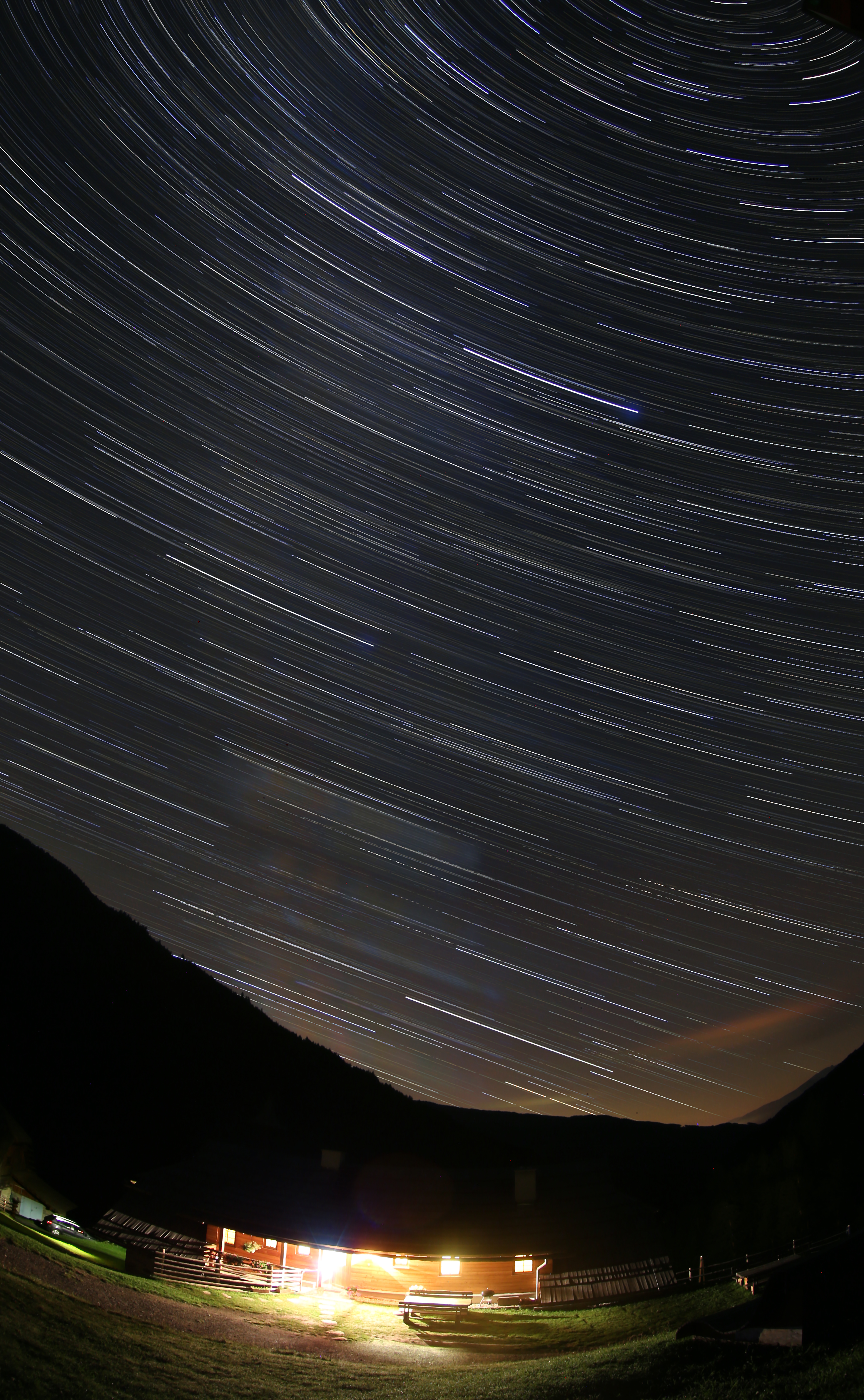 Startrails über der Sandrisser Alm in Kärnten. Ein wunderbarer Sternhimmel am Rande des Biosphärenparks Nockberge beeindruckte mich August. Eine einsam gelegene Alm in einem Meer von Sternen! Canon 6d mit Canon 8-15 / 4,0 L.