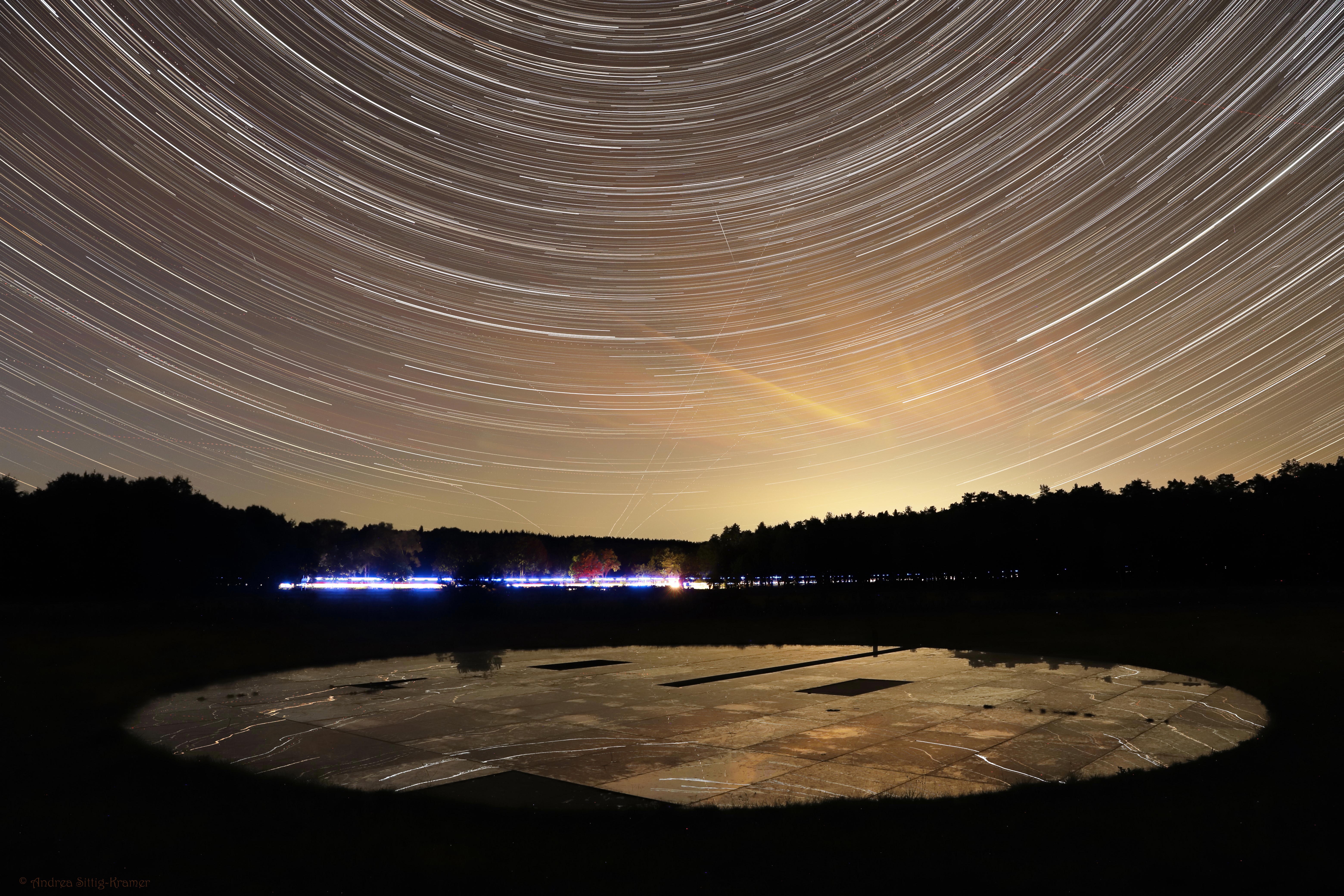 Die mondlose, sternenklare Nacht am 18./19.09.2020 bot ideale Bedingungen für mein Projekt und ich positionierte meine Kamera direkt am Kunstobjekt. Die 200 Einzelbilder habe ich mit dem Programm Startrails zu einem Summenbild mit einer Gesamtbelichtungszeit von 1 Stunde und 40 Minuten zusammengefügt. Einige Spiegelelement fand ich leider zerstört, bzw. stark verwittert vor, so dass die Sternspuren nicht ganz gleichmäßig auf dem Spiegel abgebildet wurden.