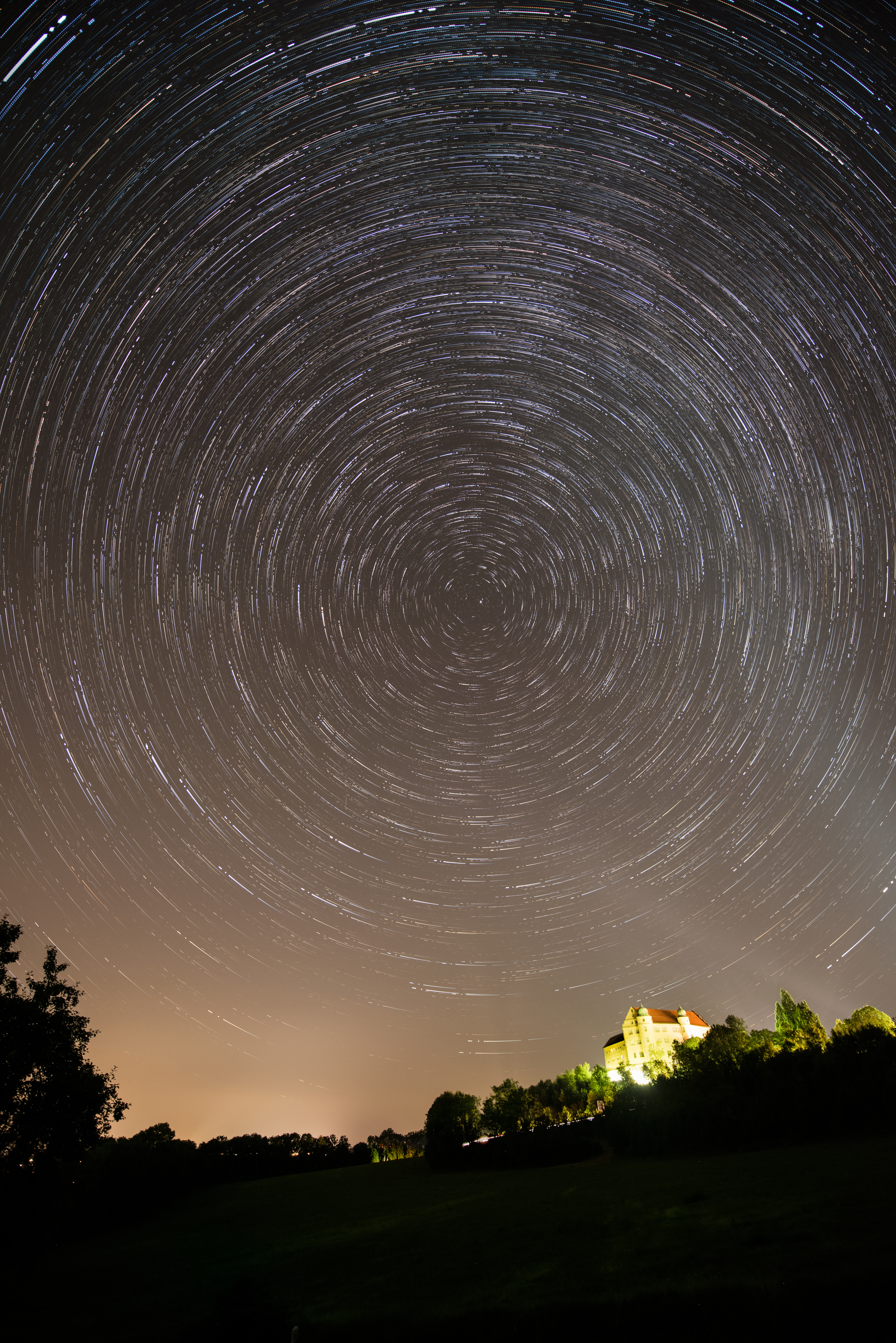 Startrails, Sternenspuren über der Kapfenburg. Die scheinbare Drehung der Sterne um den Polarstern ist eine optische Täuschung. Die Rotation wird durch die Erddrehung verursacht.