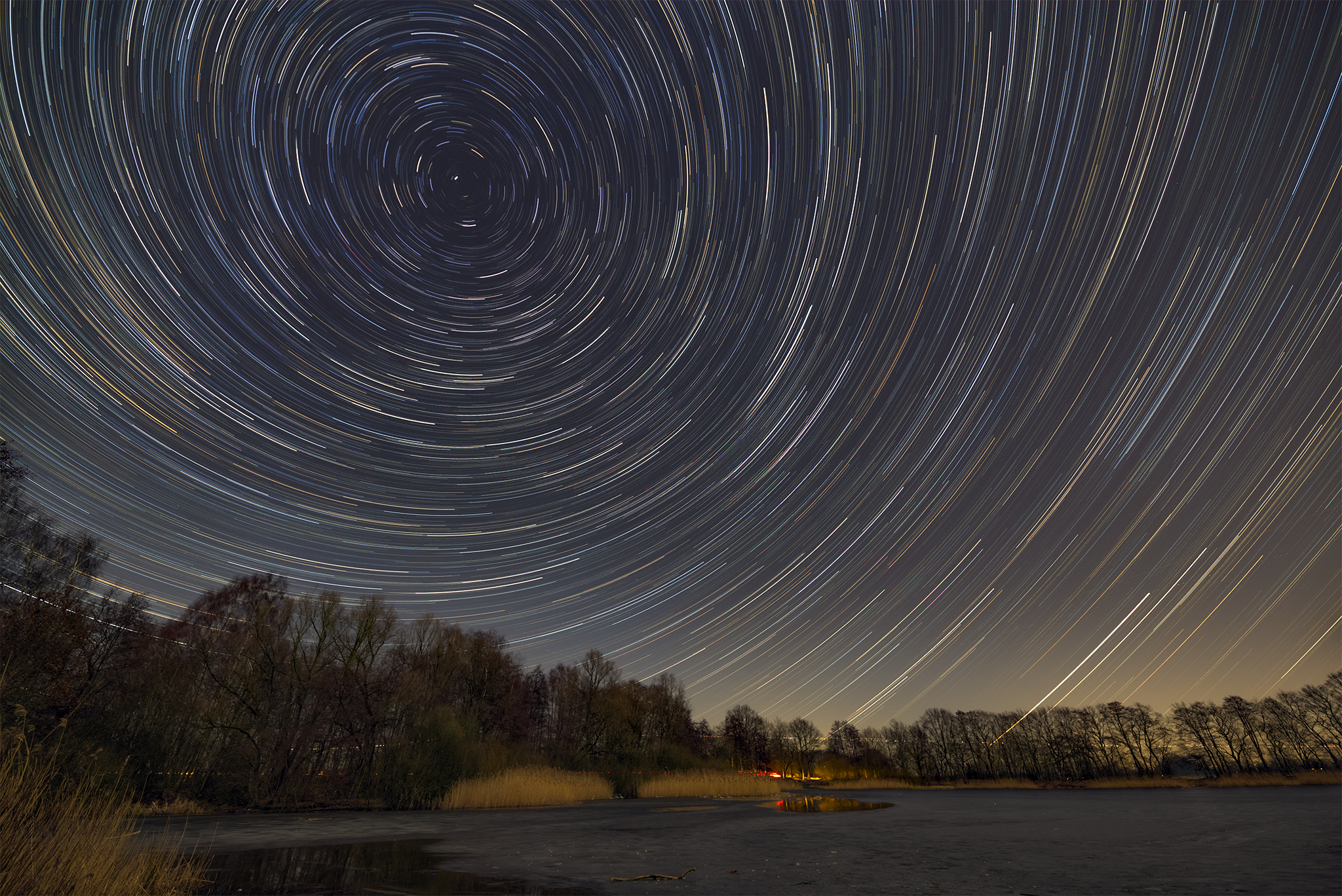 Sternenklare Nacht mit hellem Mondlicht, die beste Voraussetzung für Startrails, da das helle Licht des Mondes den Vordergrund schön aufhellt. Für das Bild habe ich 200 Aufnahmen á 25 Sekunden gemacht und als Trail im Bearbeitungsprogramm Sequator zusammengefügt. Aufgenommen am Wollnysee in Pinneberg (Schleswig-Holstein).