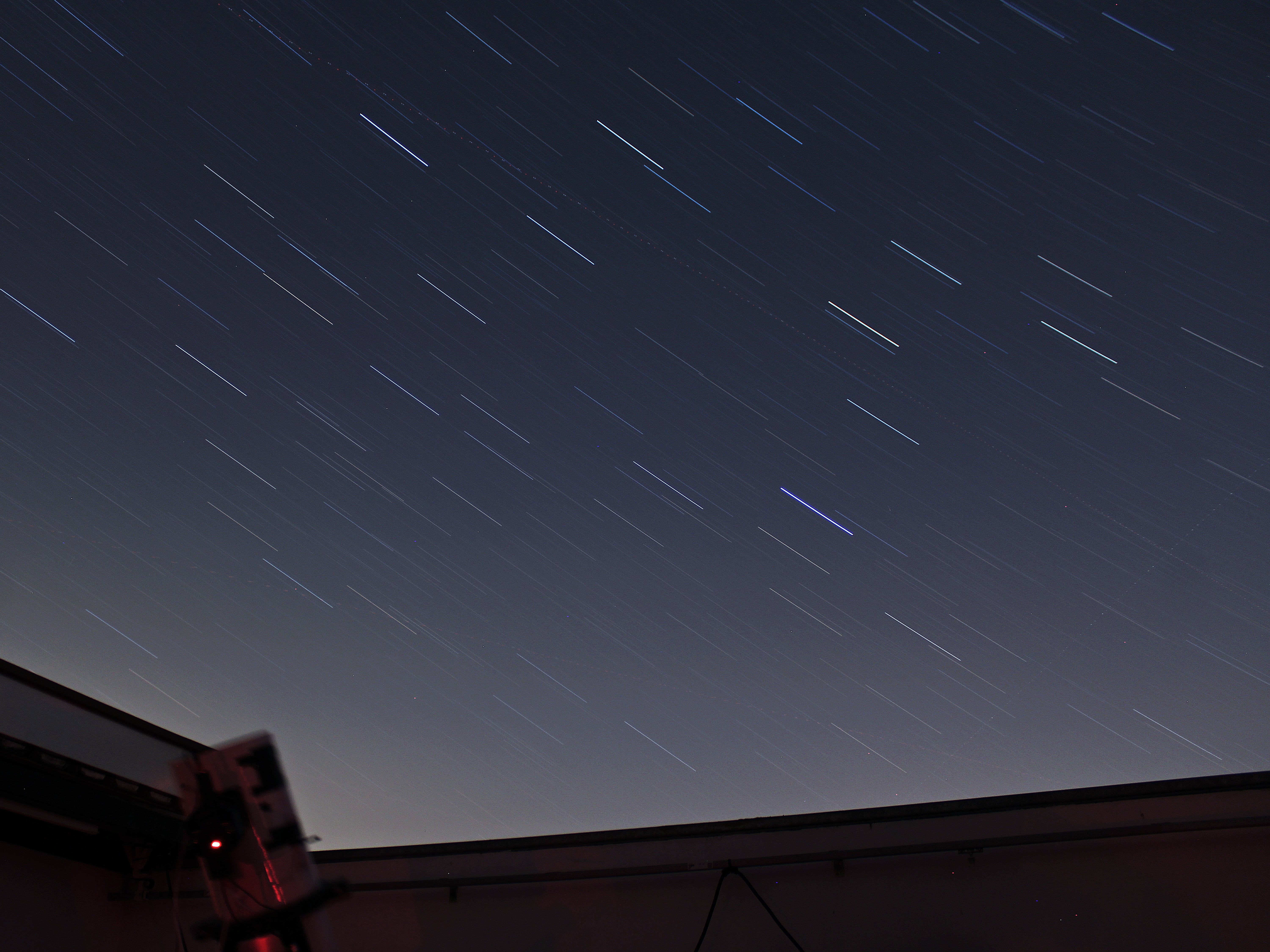 Startrails vom Sternbild Löwe aus dem Flachdachgebäude der Sternwarte Sternenwelt-Vogelsberg fotografiert. Es handelt sich um eine Einzelaufnahme.