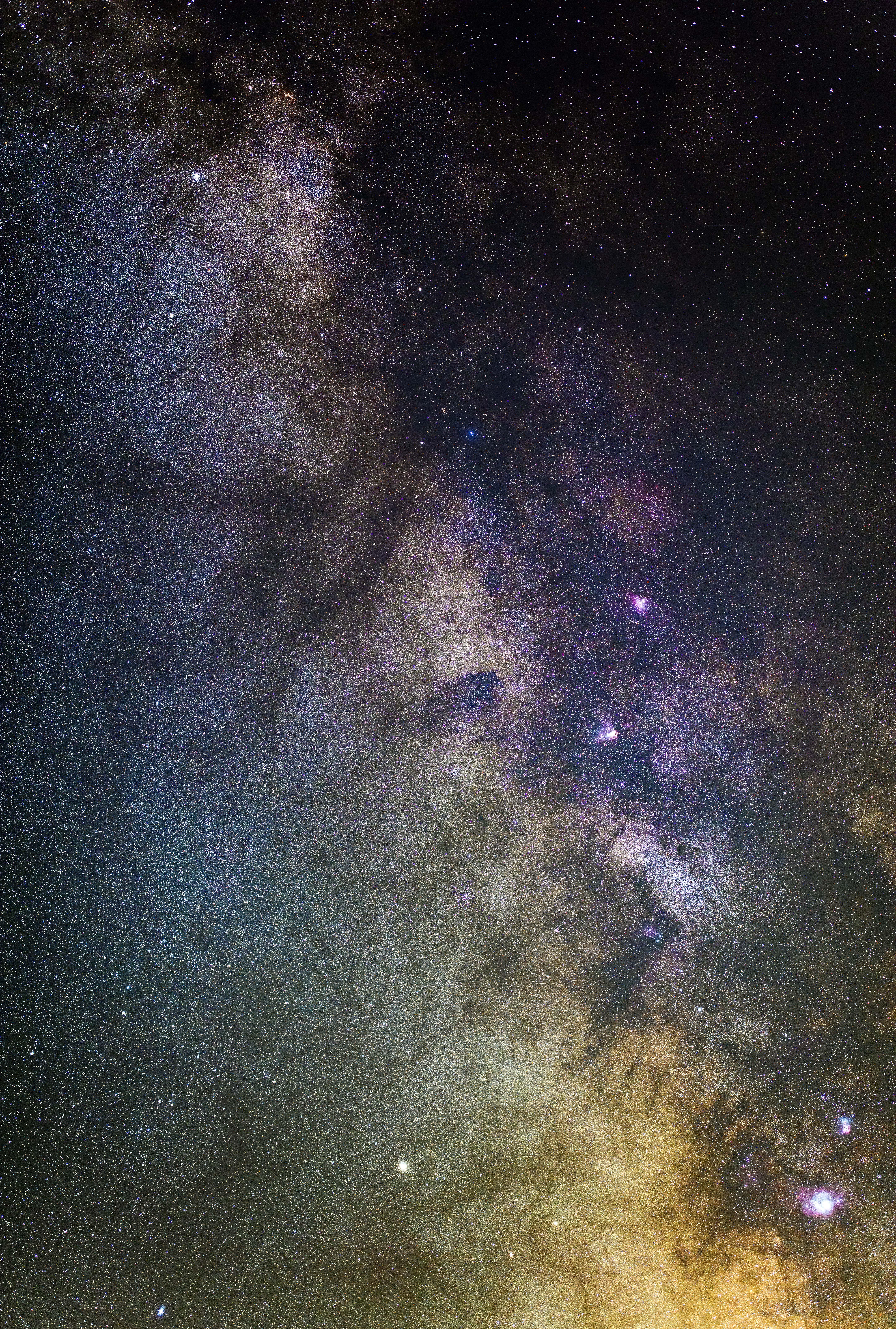 Die hohe Sternendichte der südlichen Milchstraße wollte ich in hoher Auflösung mit 85 mm Brennweite (auf Vollformat) einfangen. Dass die Staubfilamente so deutlich sichtbar werden, hatte ich gar nicht erwartet. Am unteren Ende der Aufnahme stören schon die Stadtbeleuchtungen. Einzelbild, 120s, f2, ISO 400.