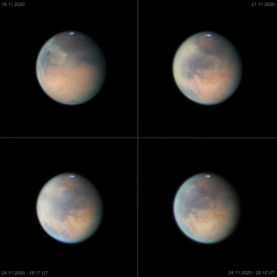 Ende November 2020 gelang an drei Abenden eine kleine Serie des Staubsturms auf Mars. Der Sturm breitete sich damals von der Solis Lacus Region nach Westen aus. Am 21. November 2020 erschien er in einer besonders auffälligen gelben Färbung, die typisch für Staubphänomene auf Mars ist.