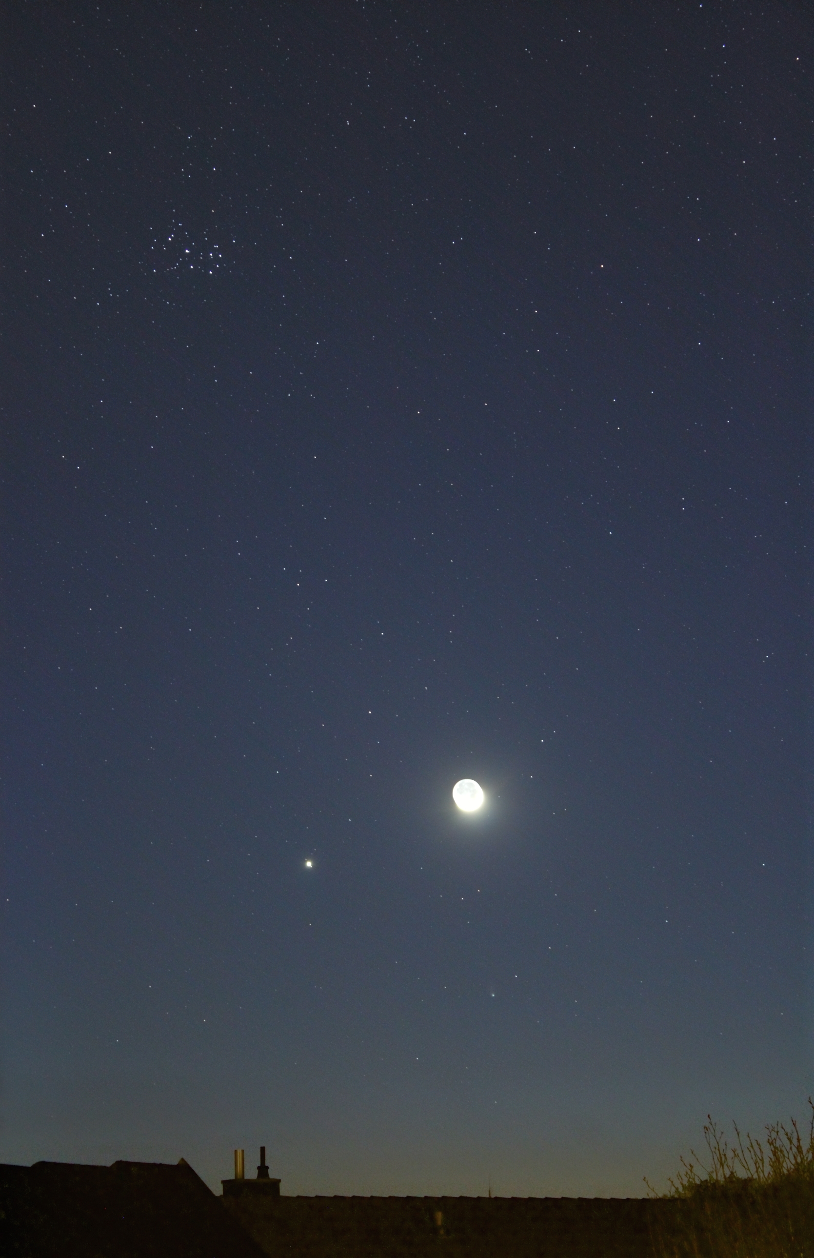 Endlich mal wieder eine schöne Konstellation am Abendhimmel und keine Wolken am Himmel! Da ich von meiner Gartensternwarte leider kaum Horizontsicht habe, musste ich improvisieren. So entstand die Aufnahme aus 20 Bildern zu je 4 Sekunden Belichtungszeit ohne Nachführung bei Blende 5.6 und ISO 3200 vom Badezimmerfenster aus.