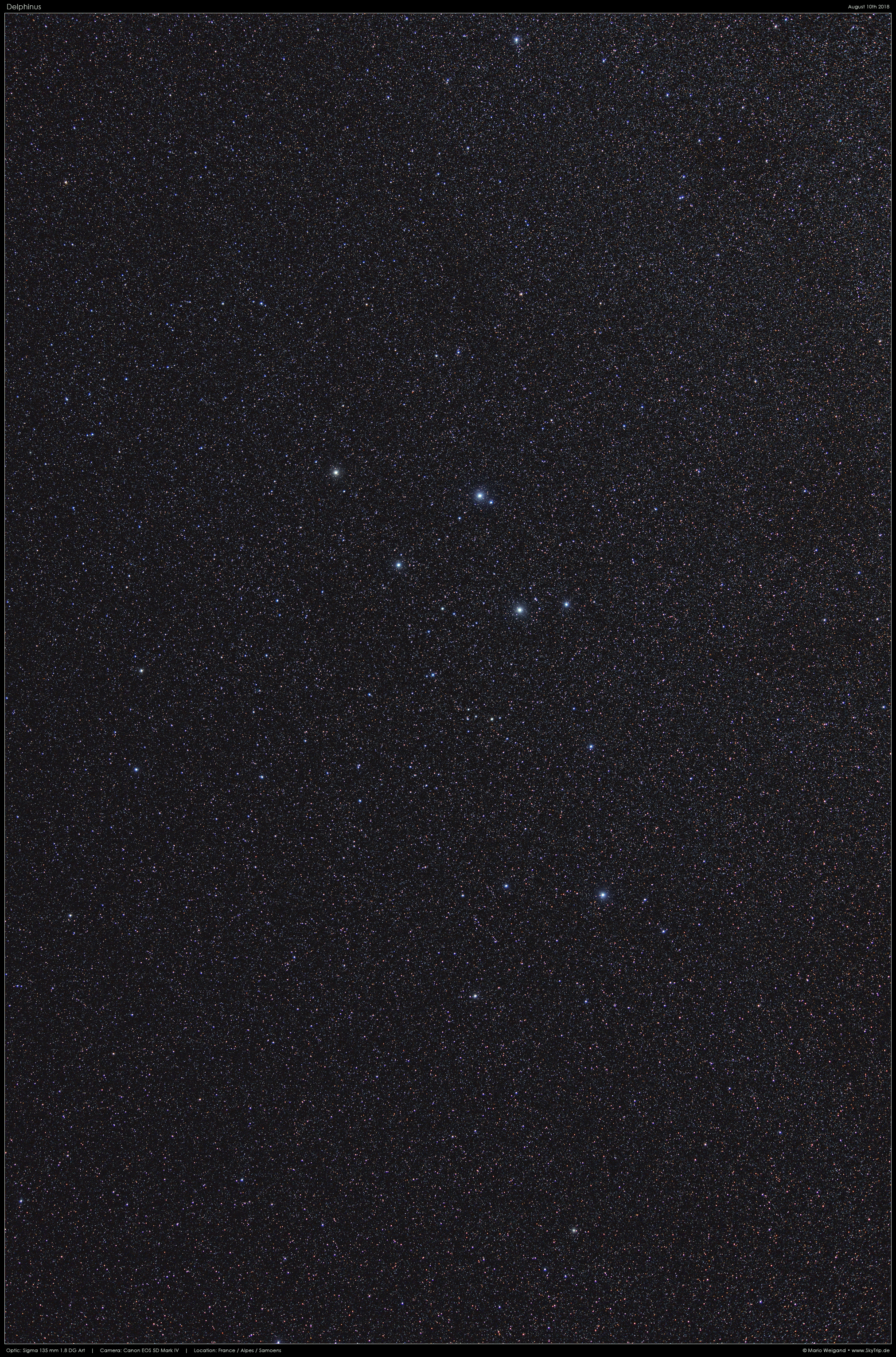 Der Delphin ist zwar ein relativ kleines Sternbild, im Gegensatz zu seinem Nachbar Equuleus jedoch markant und somit leicht zu identifizieren und wiederzufinden. Viel zu entdecken gibt es hier allerdings nicht...