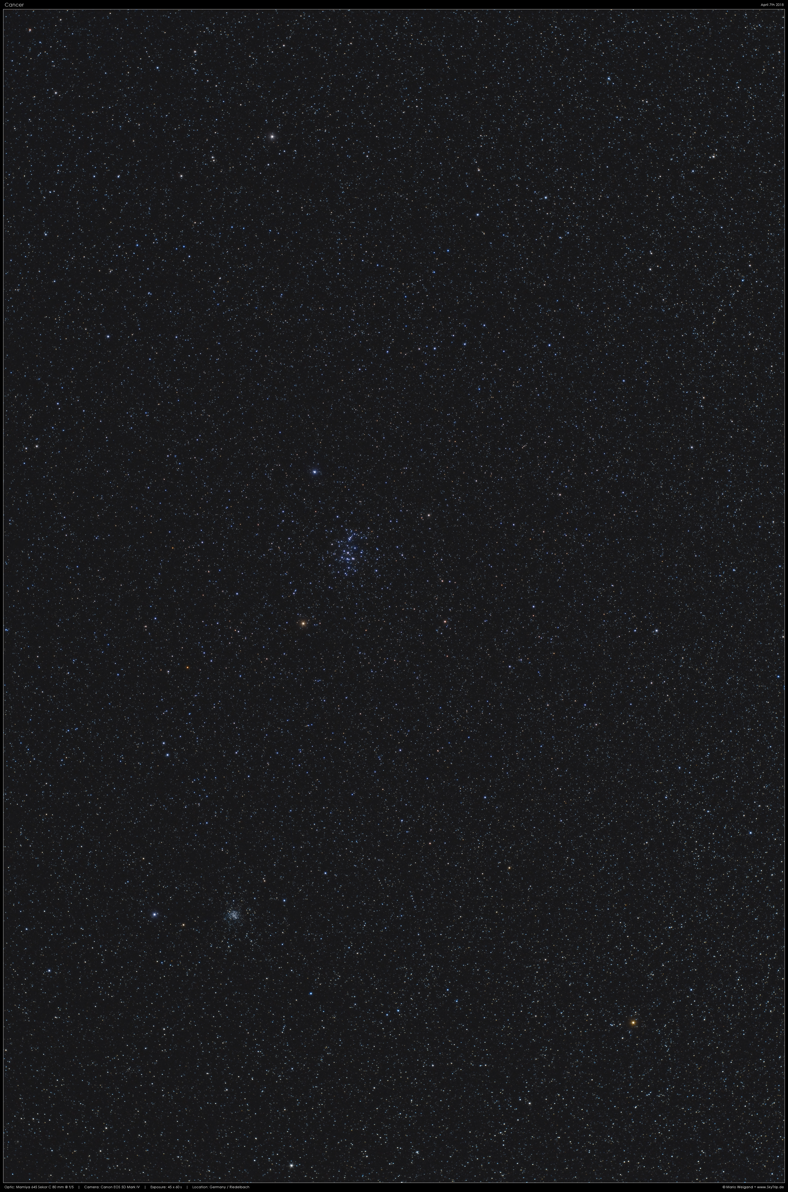 Der Krebs ist ein unauffälliges Sternbild am Winterhimmel, das aus eine Lambda-förmigen Anordnung aus Sternen von 3,5 mag oder schwächer besteht. Immerhin finden sich hier jedoch zwei sehr schöne offene Sternhaufen: Messier 44 und Messier 67. Messier 44 (Die Krippe / Preaseppe) ist mit bloßem Auge schon sehr auffällig und löst sich bereits im Fernglas in Einzelsterne auf. Zur Orientierung und Identifikation gibt es hier eine beschriftete Version: http://www.skytrip.de/cnc-1a.htm