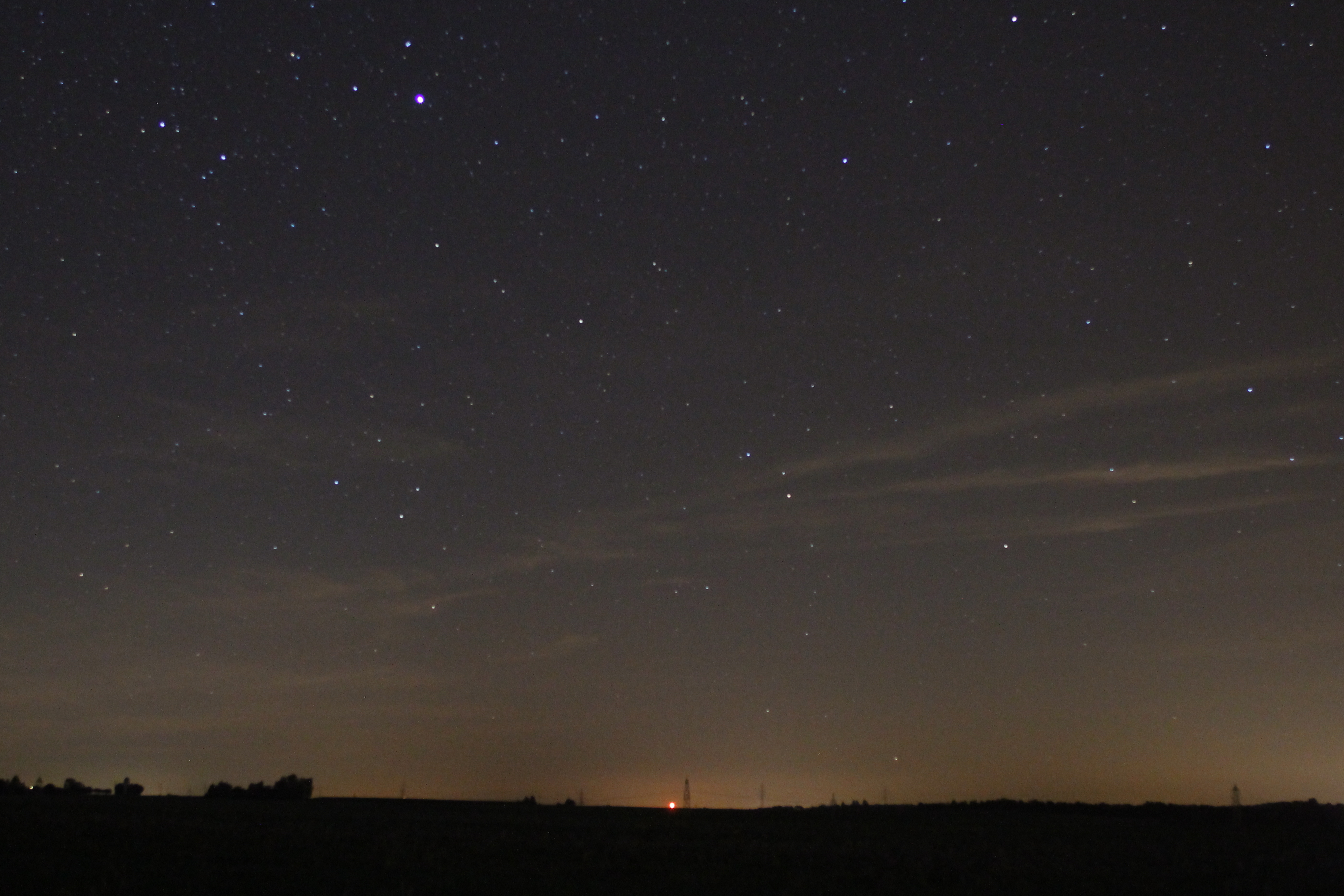 Sternbild Leier über dem Nordwesthorizont, aufgenommen am 3. Oktober 2013. Das orangene Licht knapp über dem Horizont ist die Flugsicherheitslampe auf der Spitze des 273 Meter hohen Hauptsendemastes des Senders Mühlacker.