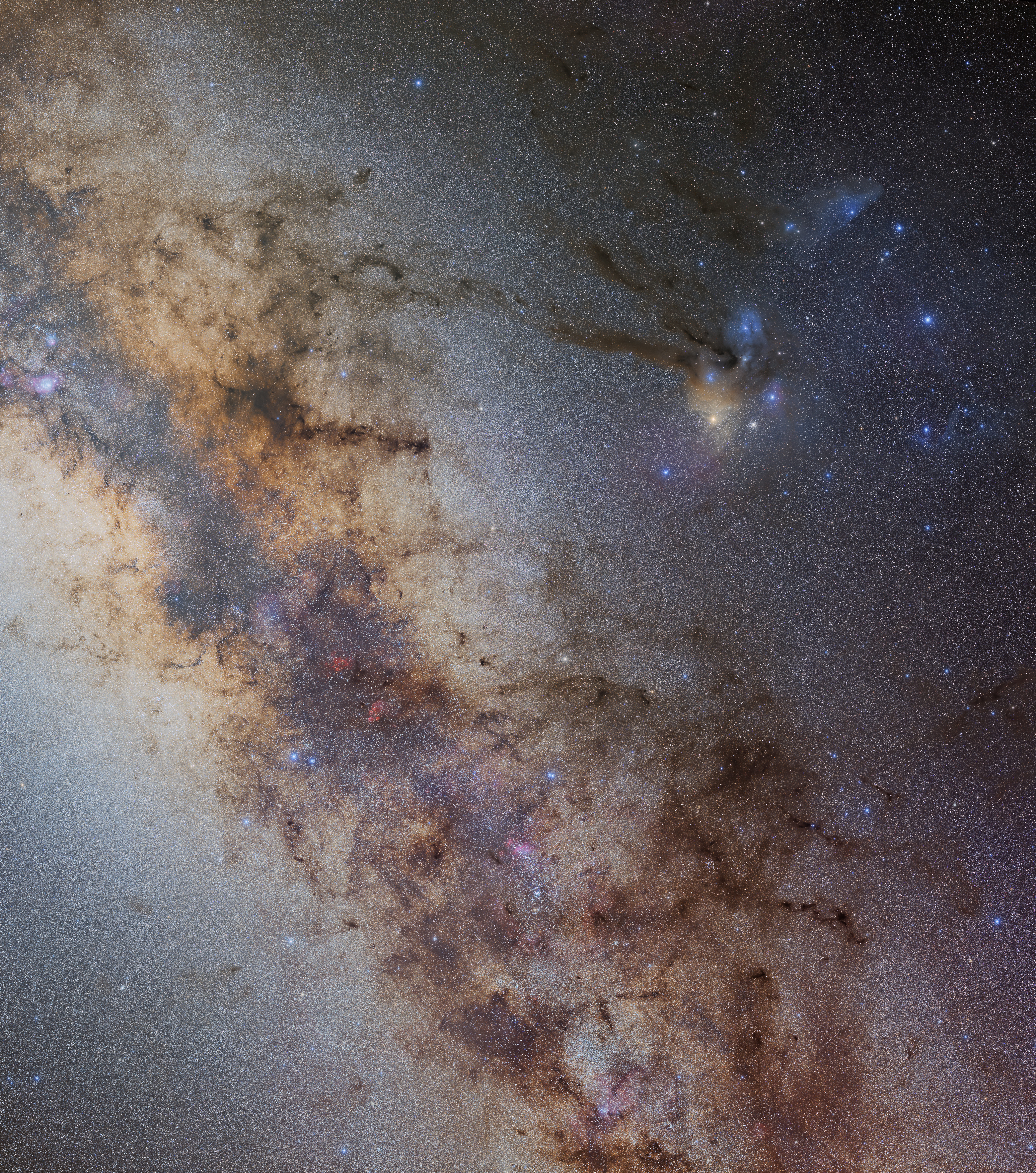 Unter bestem Himmel in Namibia entstanden auf der Astrofarm Kiripotib Ende Juni 2014 in vier Nächten insgesamt 245 Einzelaufnahmen (total: 20,5 h) mit einer EOS 5D II + EF 2,0/135mm L, die später dann in PixInsight zu einem 3x4 Mosaik zusammengefügt wurden. Die gezeigte Region umfasst das Zentrum der Milchstraße, das Sternbild Skorpion, eine Vielzahl von Messierobjekten, darunter die beiden südlichsten M 6 und M 7 sowie eine große Zahl von Dunkelwolken, die wie ein dunkler Fluss aus dem Band der Milchstraße herauszufließen scheinen.