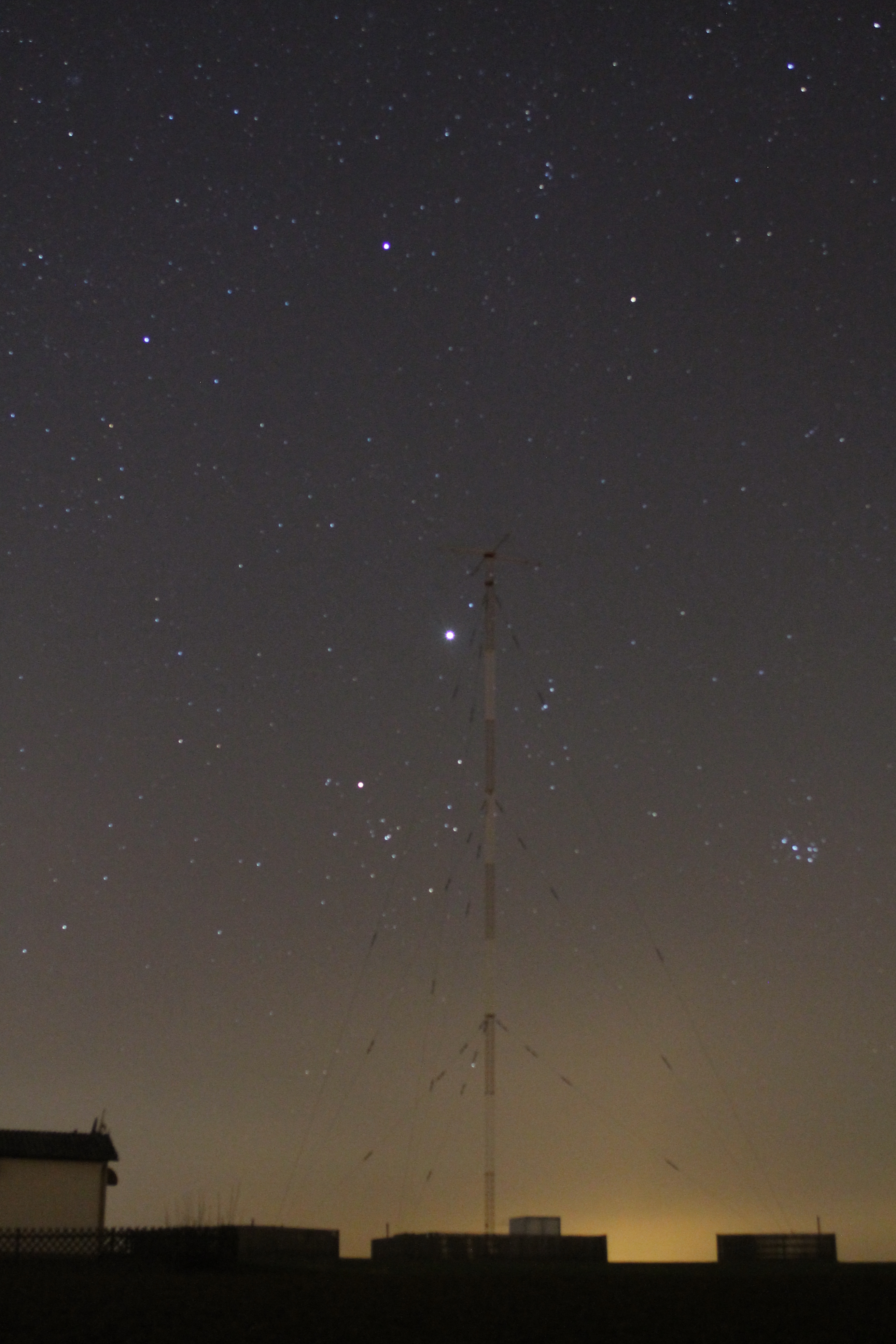 Leserbilder Astronomie: Sternbild Stier mit Jupiter versinkt hinter dem Mittelwellensendemast Hirschlanden