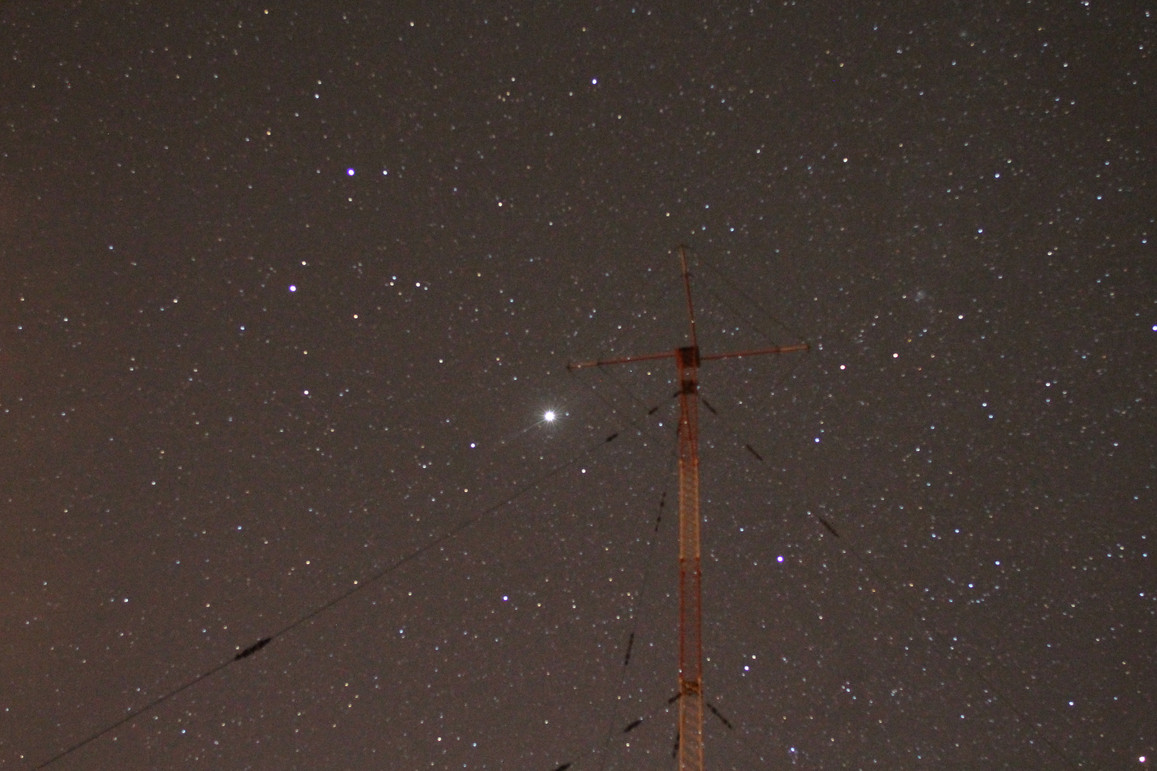 Leserbilder Astronomie: Sternbild Zwillinge mit Jupiter und Sendemast im Vordergrund