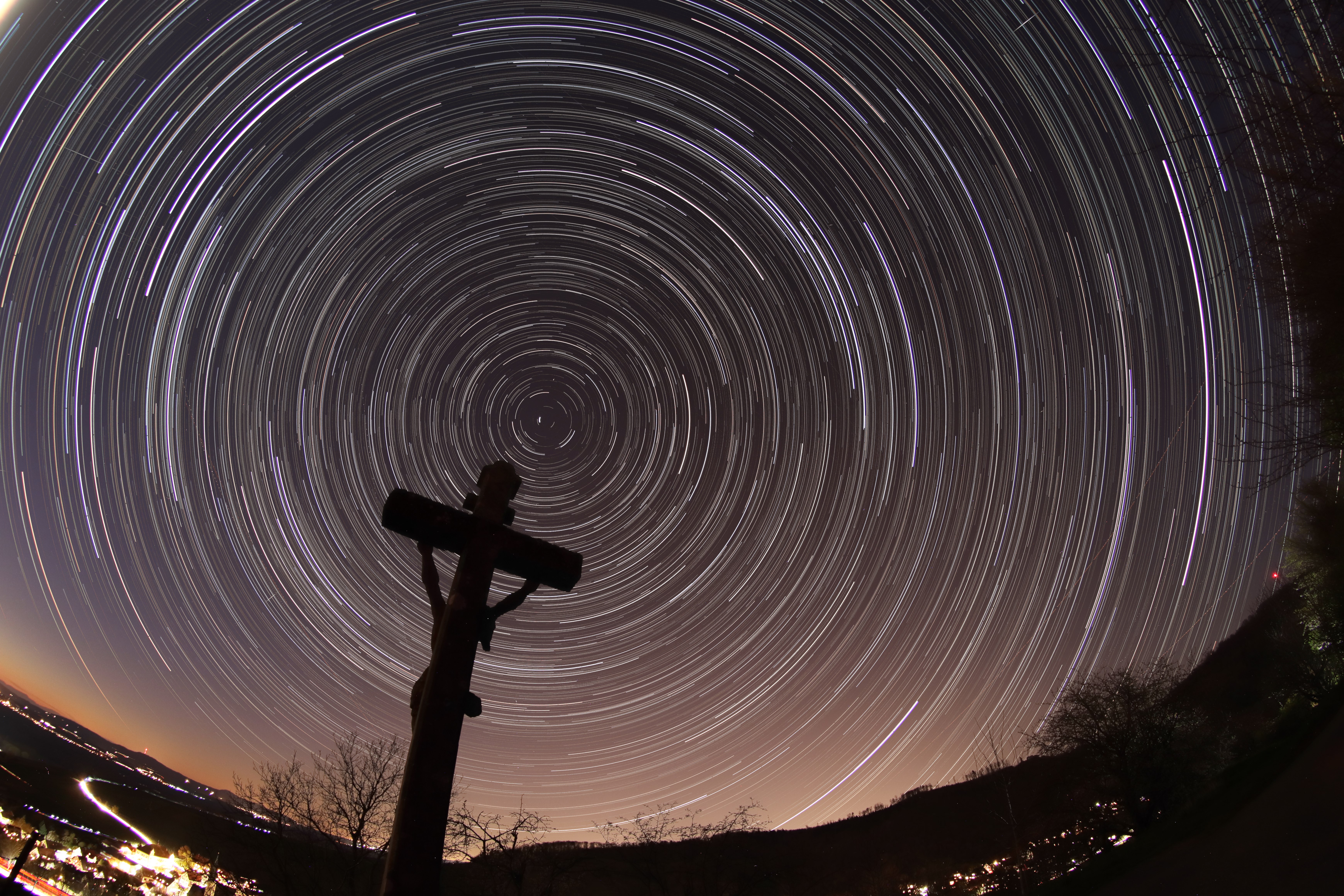 Die Aufnahme zeigt die kreisförmigen Strichspuren, welche die Sterne während drei Stunden um ein Hochkreuz oberhalb von Ebringen bei Freiburg ziehen.