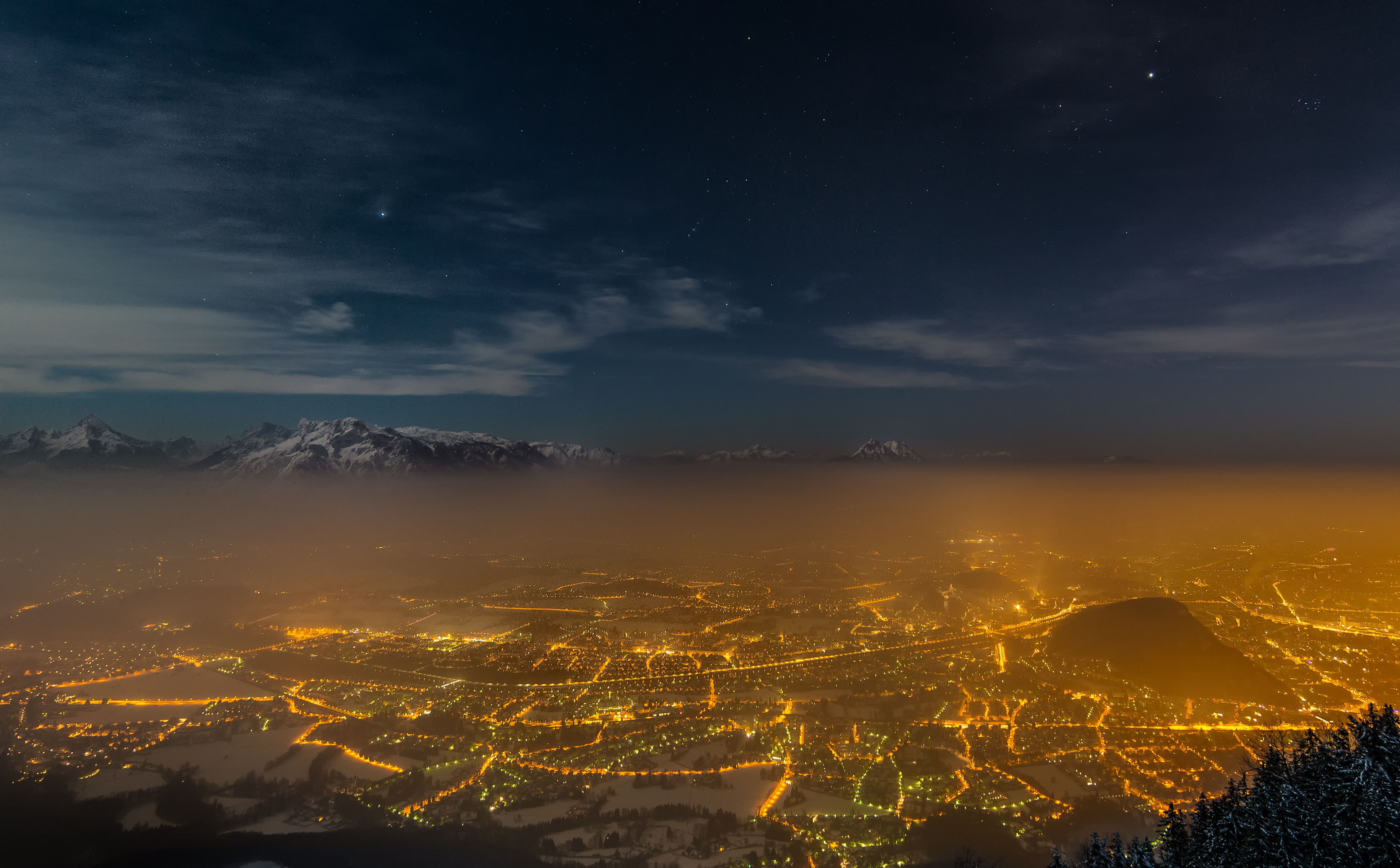 Die Stadt Salzburg versteckt sich unter einer leichten Nebeldecke. Trotz Lichtverschmutzung durch die Stadt und den hellen Mond erblickt man hier trotzdem noch interessante Sternbilder. Single-Frame-Aufnahme vom Gaisberg (Hausberg) aus.