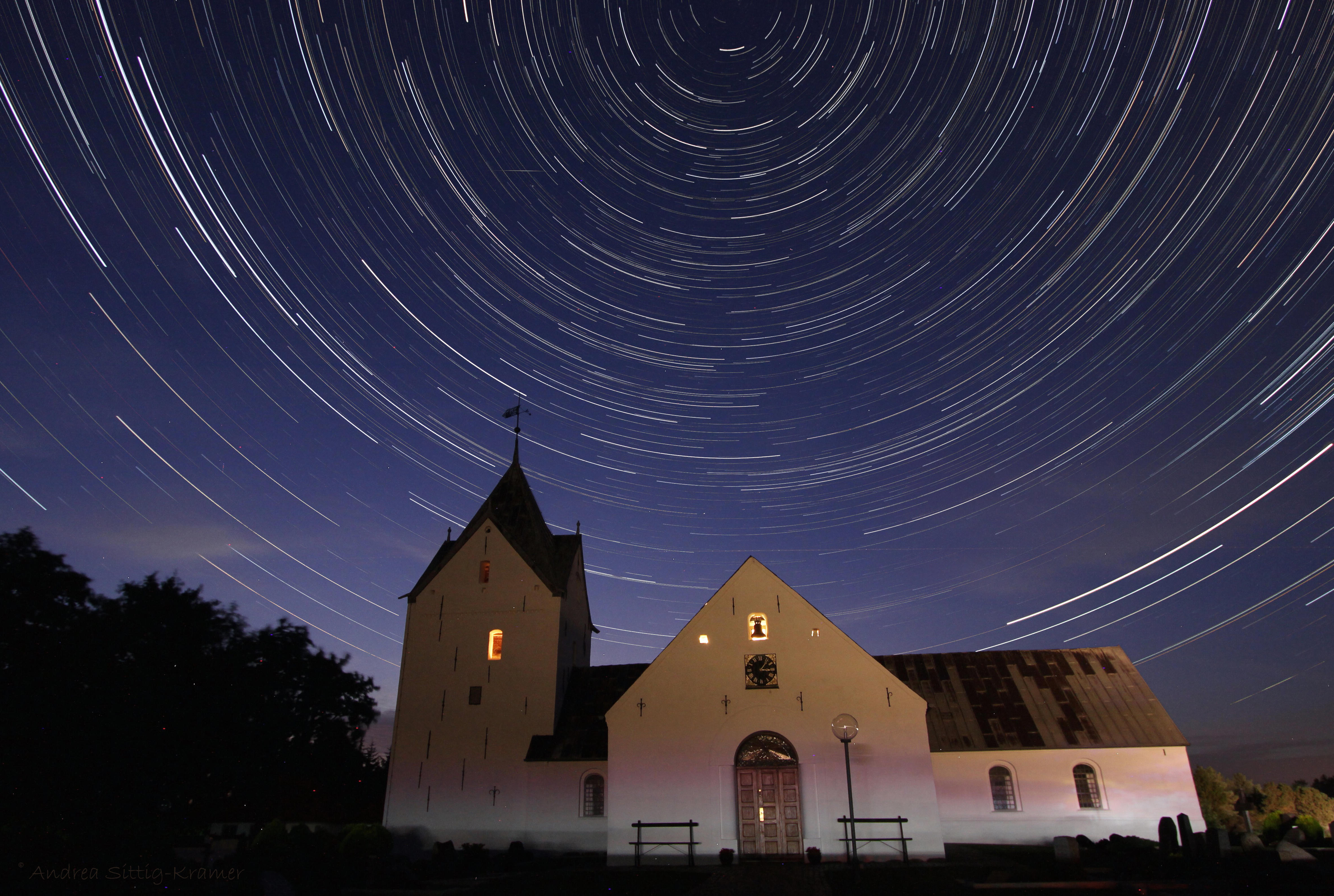 Leserbilder Astronomie: Sternen-Strichspuren über der Kirche von Römö am 26. Juli 2019